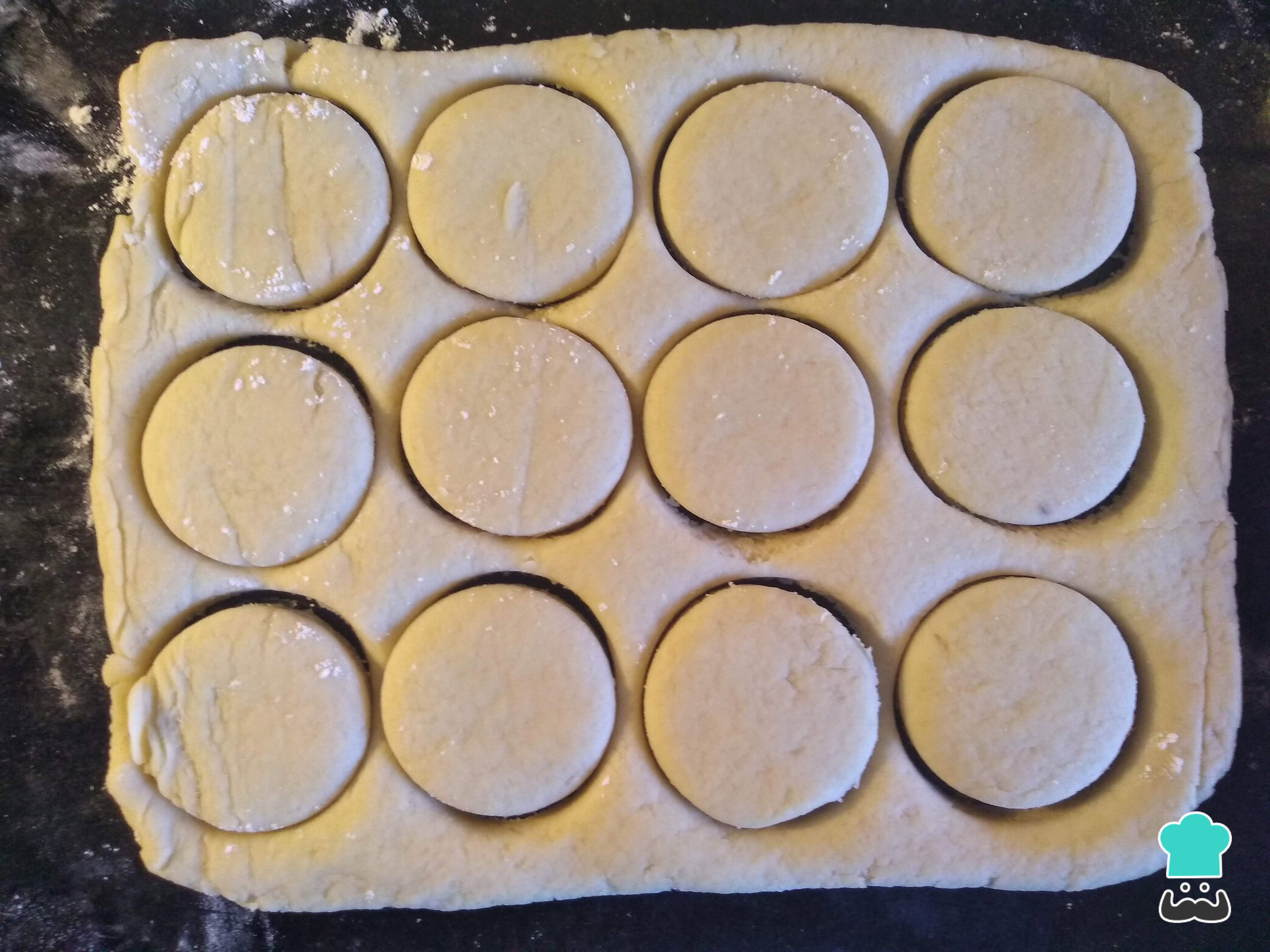Estira toda la masa hasta que quede de 1,5 cm de grosor. Usa un cortador para cortar los bizcochitos salados, pueden ser redondos o cuadrados dependiendo de cómo te gusten más.