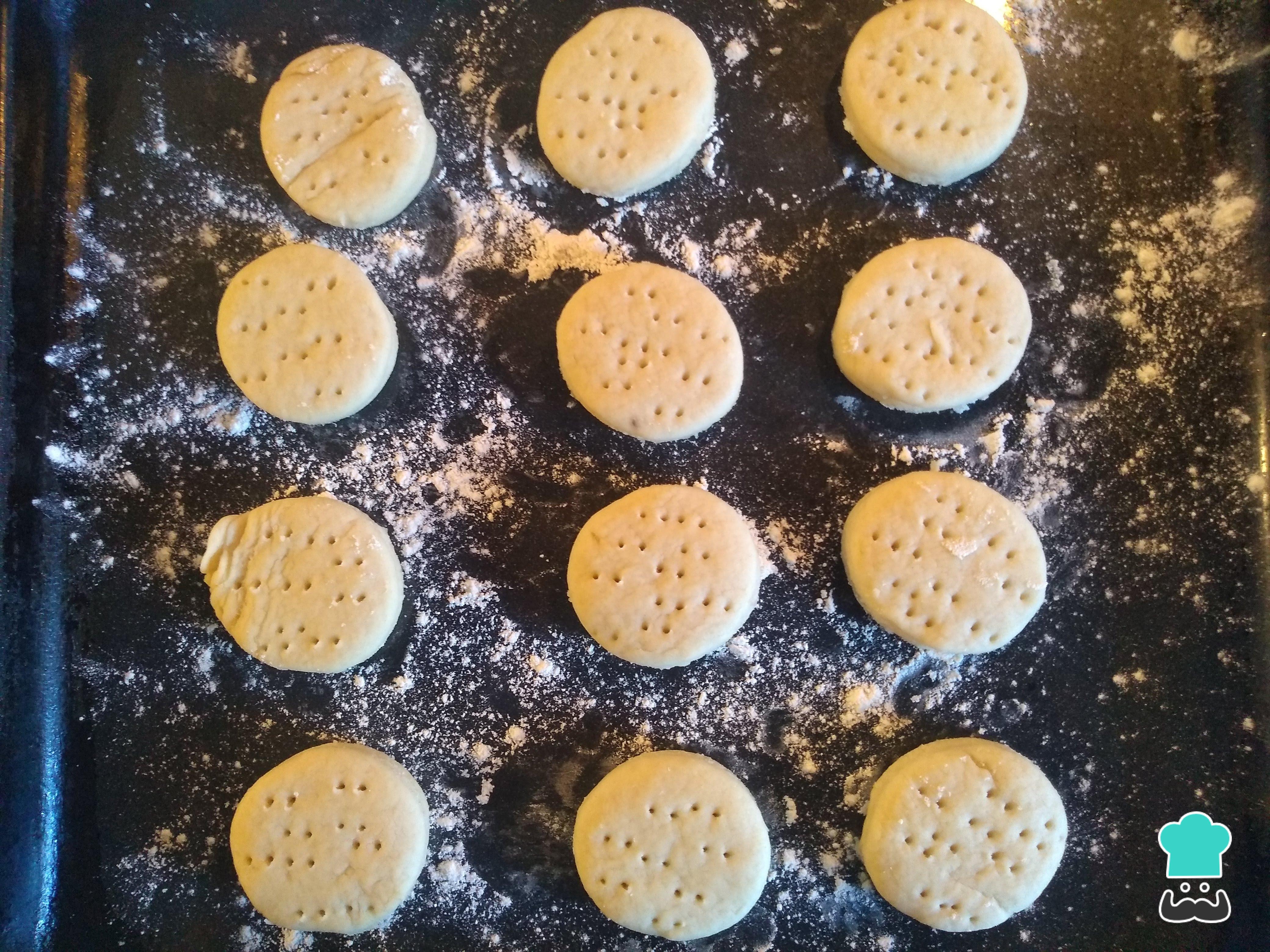 Con el horno precalentado a 180 ºC, coloca los bizcochitos caseros sobre una placa enharinada y pínchalos con un tenedor o palillo.