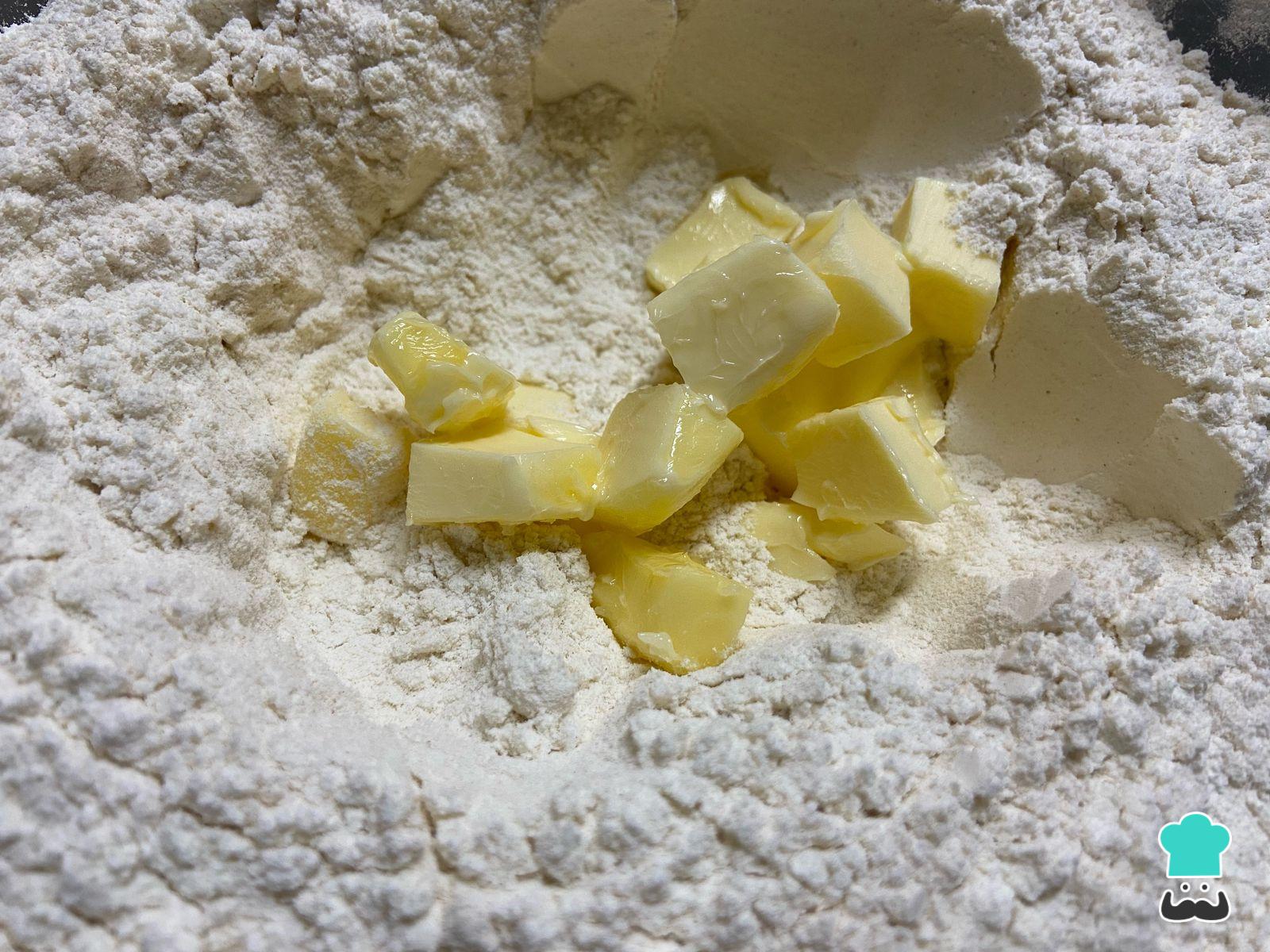 En un recipiente mezcla la harina con la levadura y, luego, incorpora la grasa cortada en cubos, realiza un arenado.