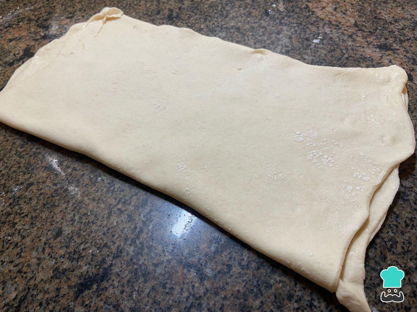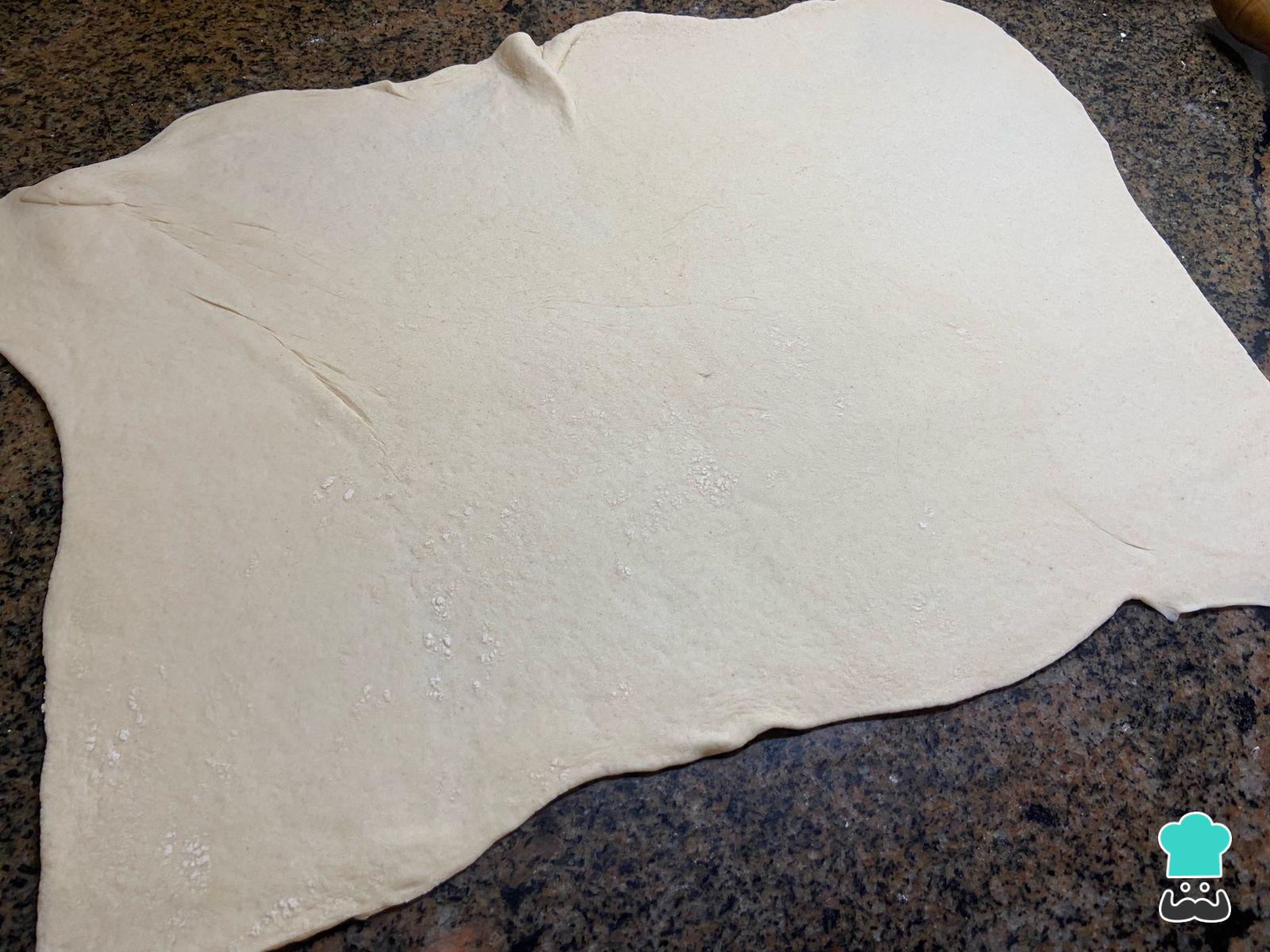 Cuando el bollo haya duplicado su volumen, espolvorea la mesada con harina y estira con palote en forma de rectángulo de 3 mm de alto.