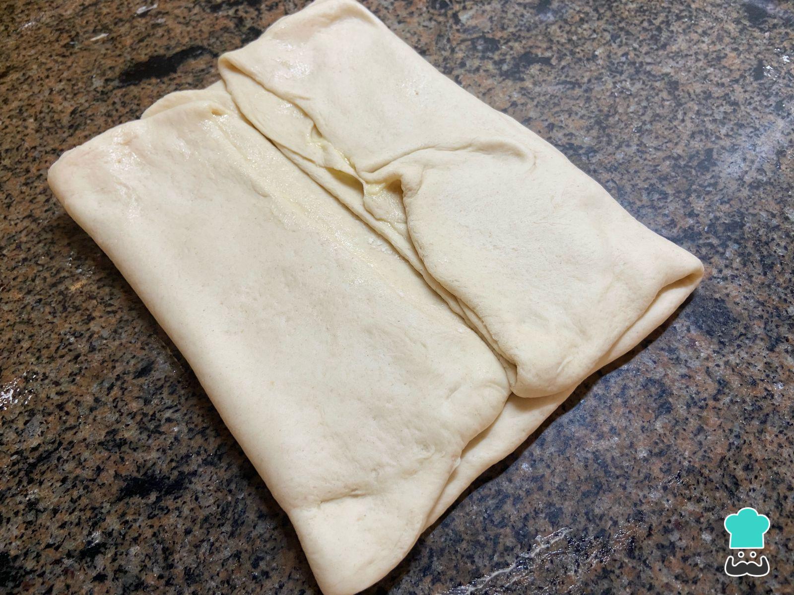 Unta el rectángulo con la grasa blanda y realiza una vuelta simple, es decir, pliega la masa en 3 partes.