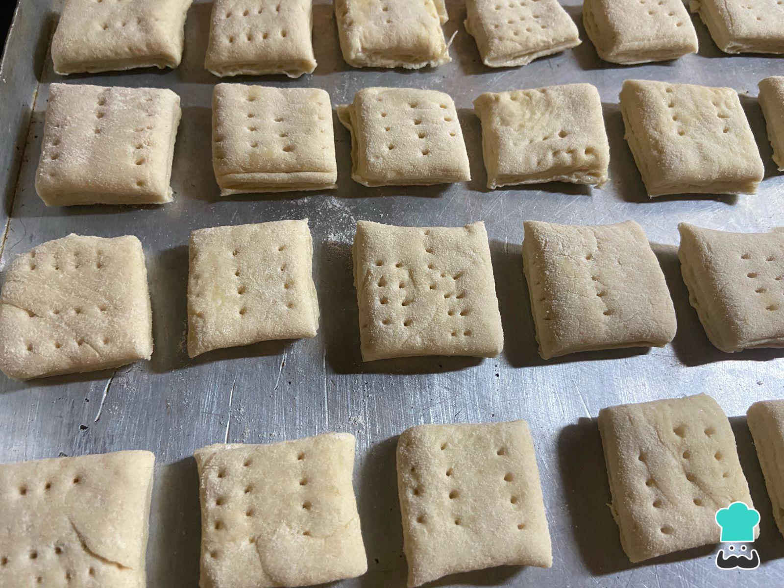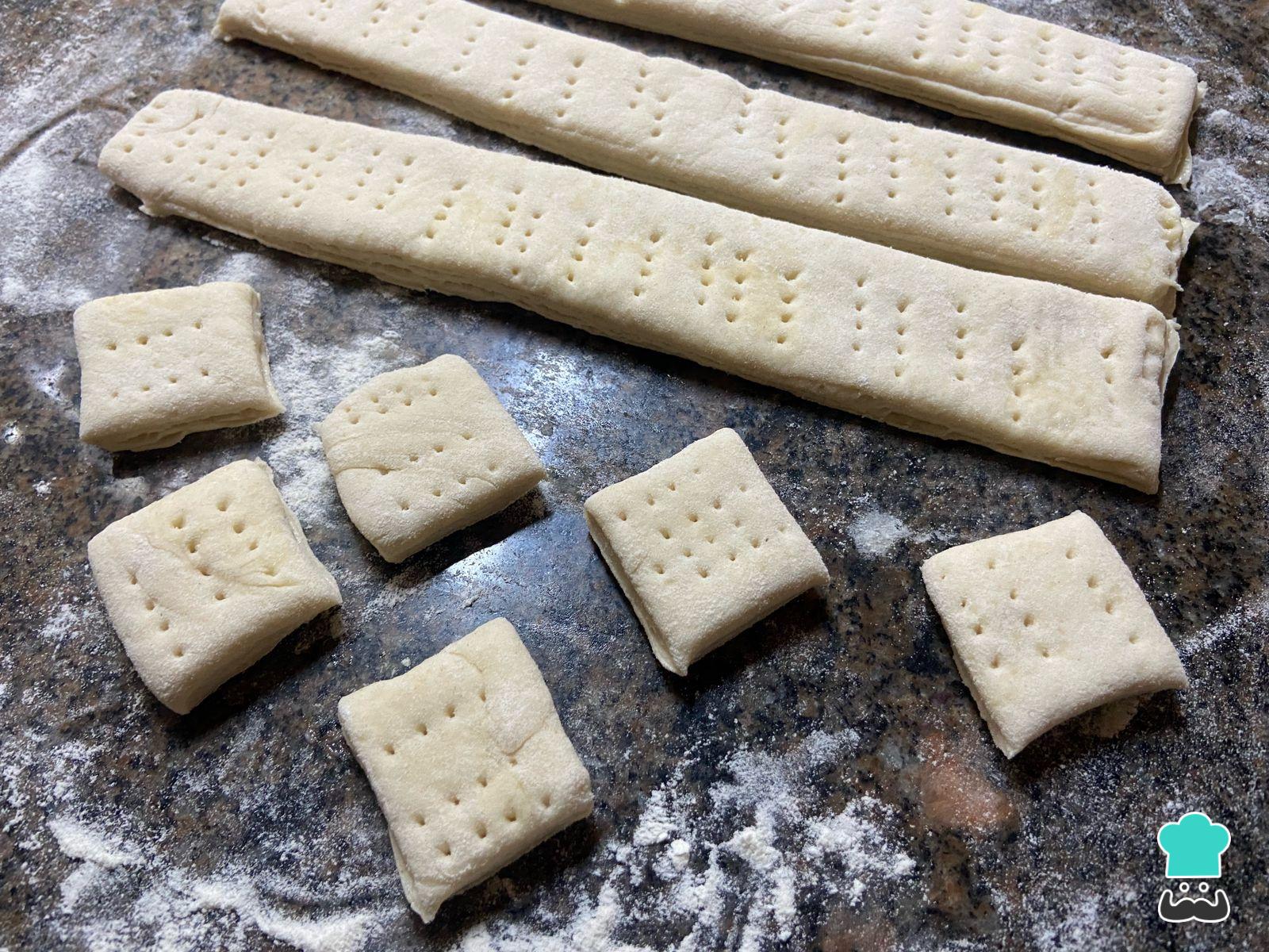 Cuando la masa ya haya reposado, estírala una vez más sobre la mesada y, en este caso, debes hacer un rectángulo de 2 o 3 cm de espesor. Recorta los bordes para emparejar y con un tenedor, pincha la superficie. Ahora corta tiras de aproximadamente 2 cm y, luego, divídelas en cuadrados.