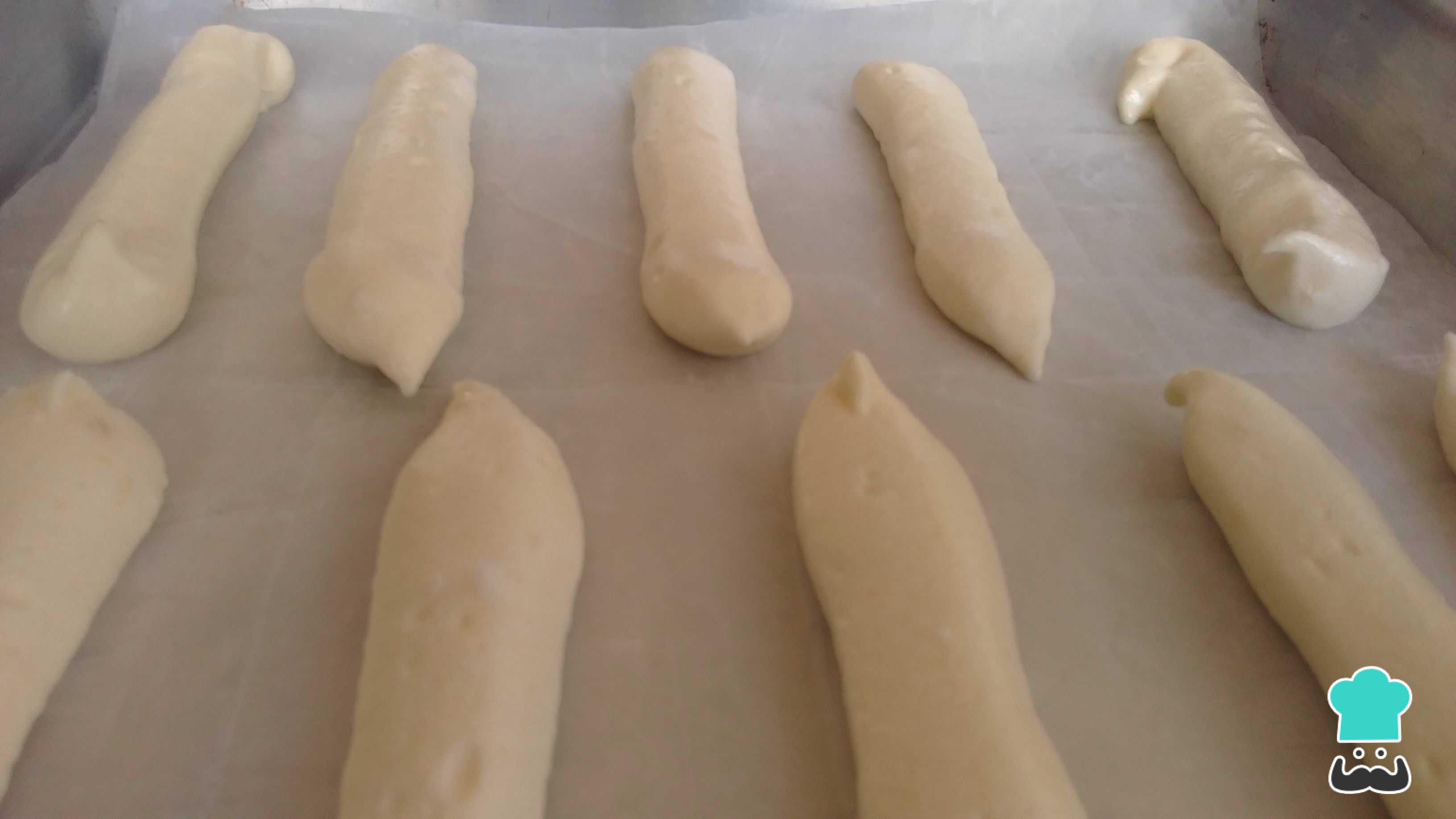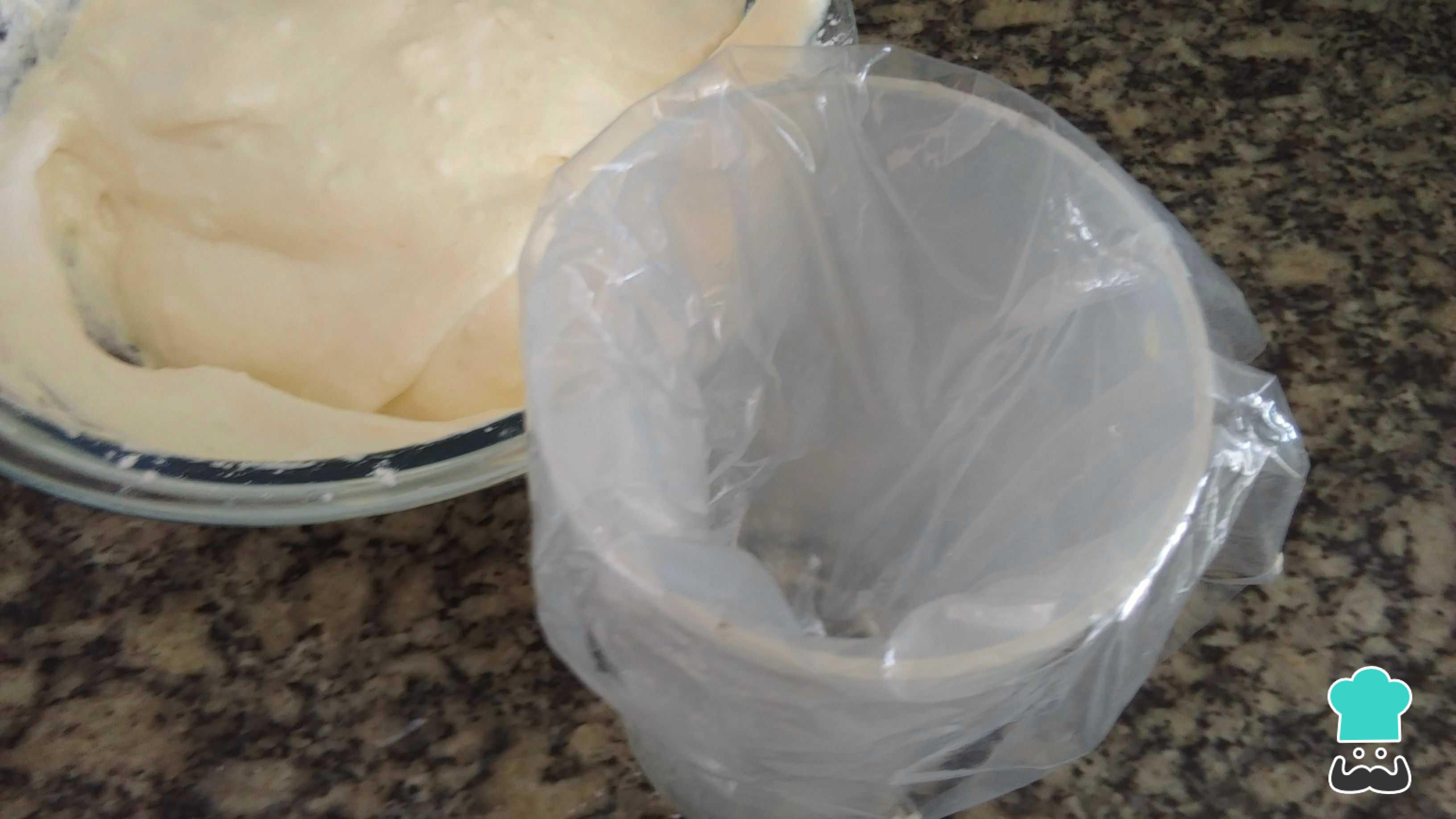 Prepara una manga pastelera con una boquilla redonda. Si no tienes, puedes improvisar una manga cogiendo una bolsa de plástico y haciendo un corte en la esquina de 2 a 2,5 cm. Coloca la manga en un vaso para que sea más fácil de llenar e introduce la masa.