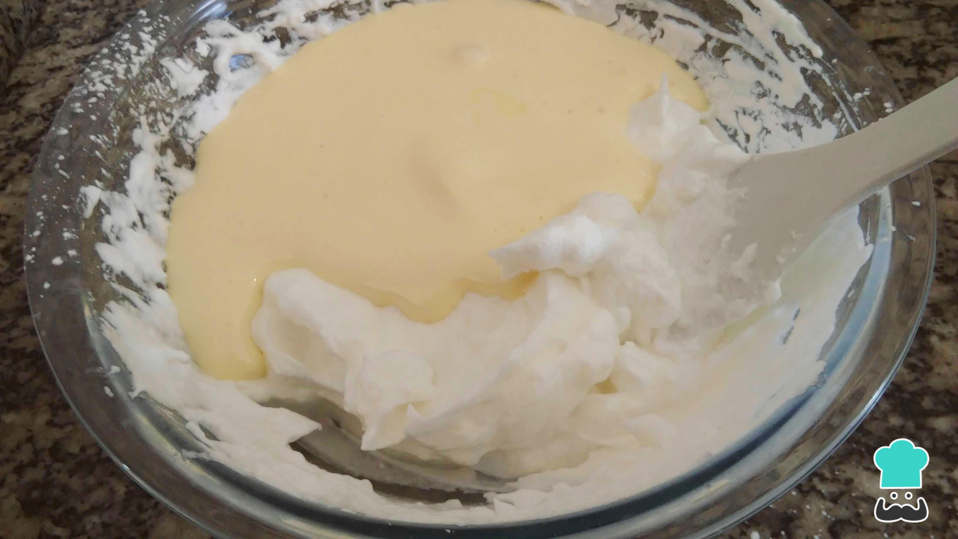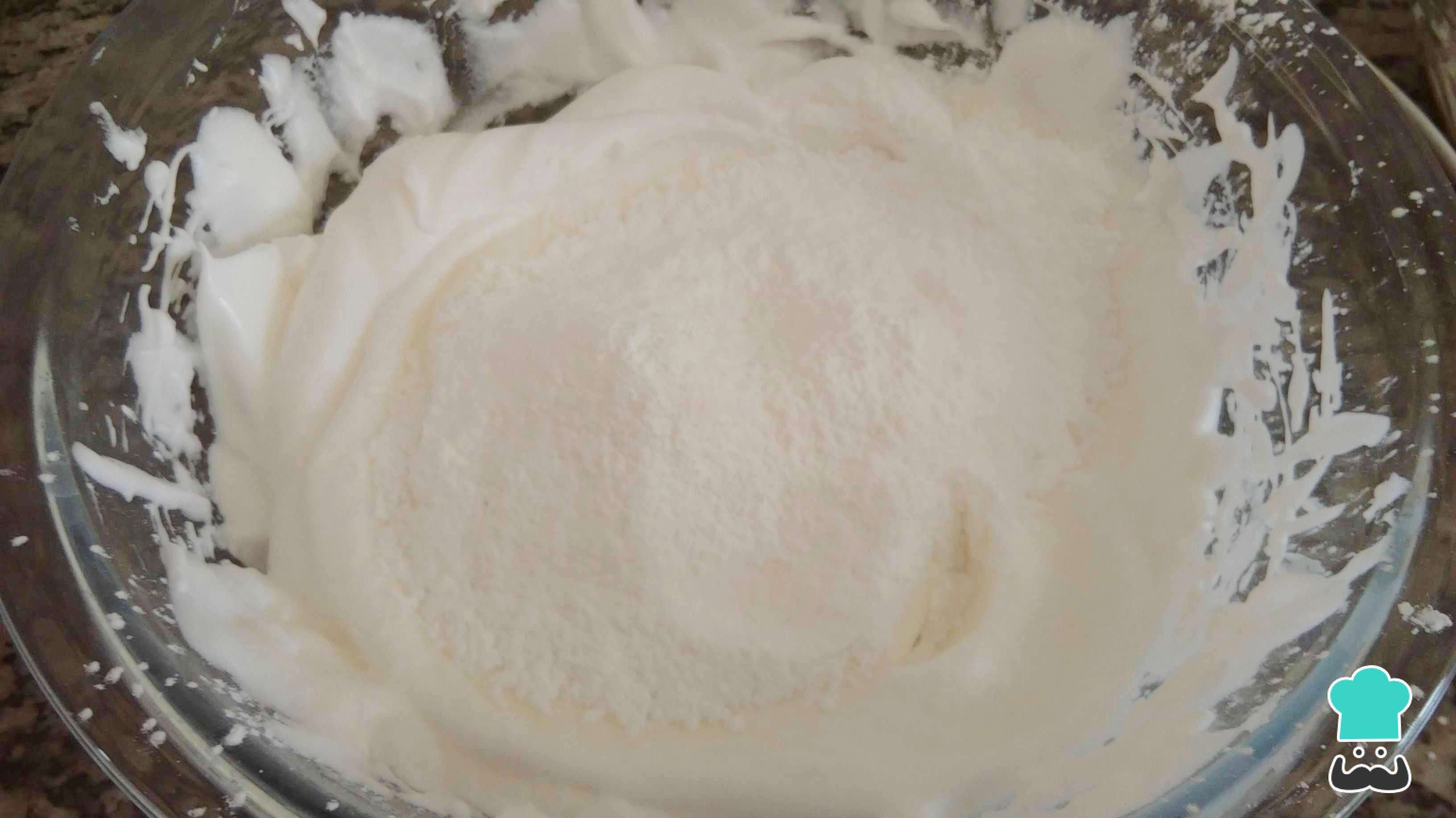 Una vez que tienes las dos mezclas montadas, adiciona el almidón a las claras. Utiliza un tamiz o colador para soltar bien las partículas de maicena. Aparta la batidora y mezcla con una espátula de forma envolvente y con delicadeza, pero asegúrate de mezclar completamente.