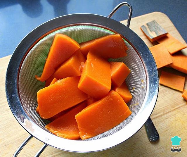 Para el puré de calabaza, yo cociné la calabaza al vapor durante 20 minutos aproximadamente. Si quieres, puedes cocerla, pero deberás tener en cuenta que tendrás que escurrirla muy bien.