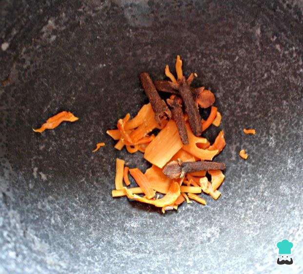 Precalentamos el horno a 175-180ºC. Si no tienes clavo en polvo, puedes hacer como he hecho yo, coger un mortero y mezclar clavos de olor con el macis.
