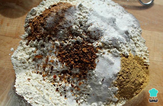 Cogemos un bol y tamizamos la harina con el polvo de hornear, el bicarbonato, sal, canela, jengibre, nuez moscada y clavo en polvo. Reservamos la mezcla para más adelante.