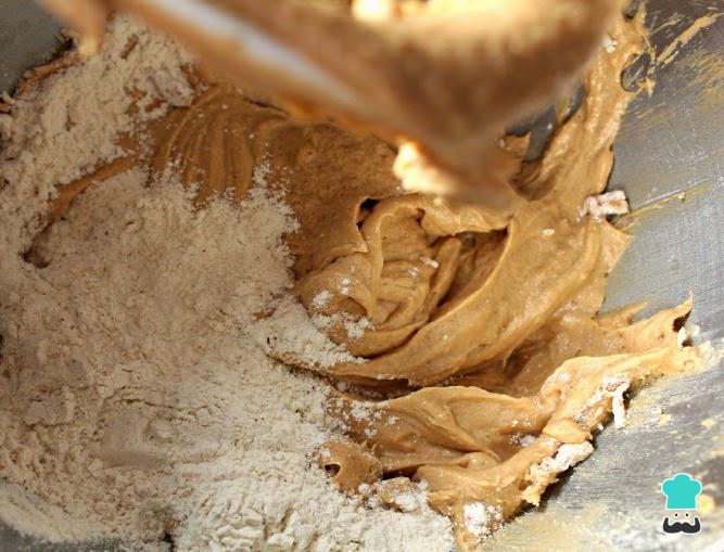 Añadimos la tercera parte de la mezcla de harina y batimos hasta integrarla en la masa del bizcocho de calabaza.