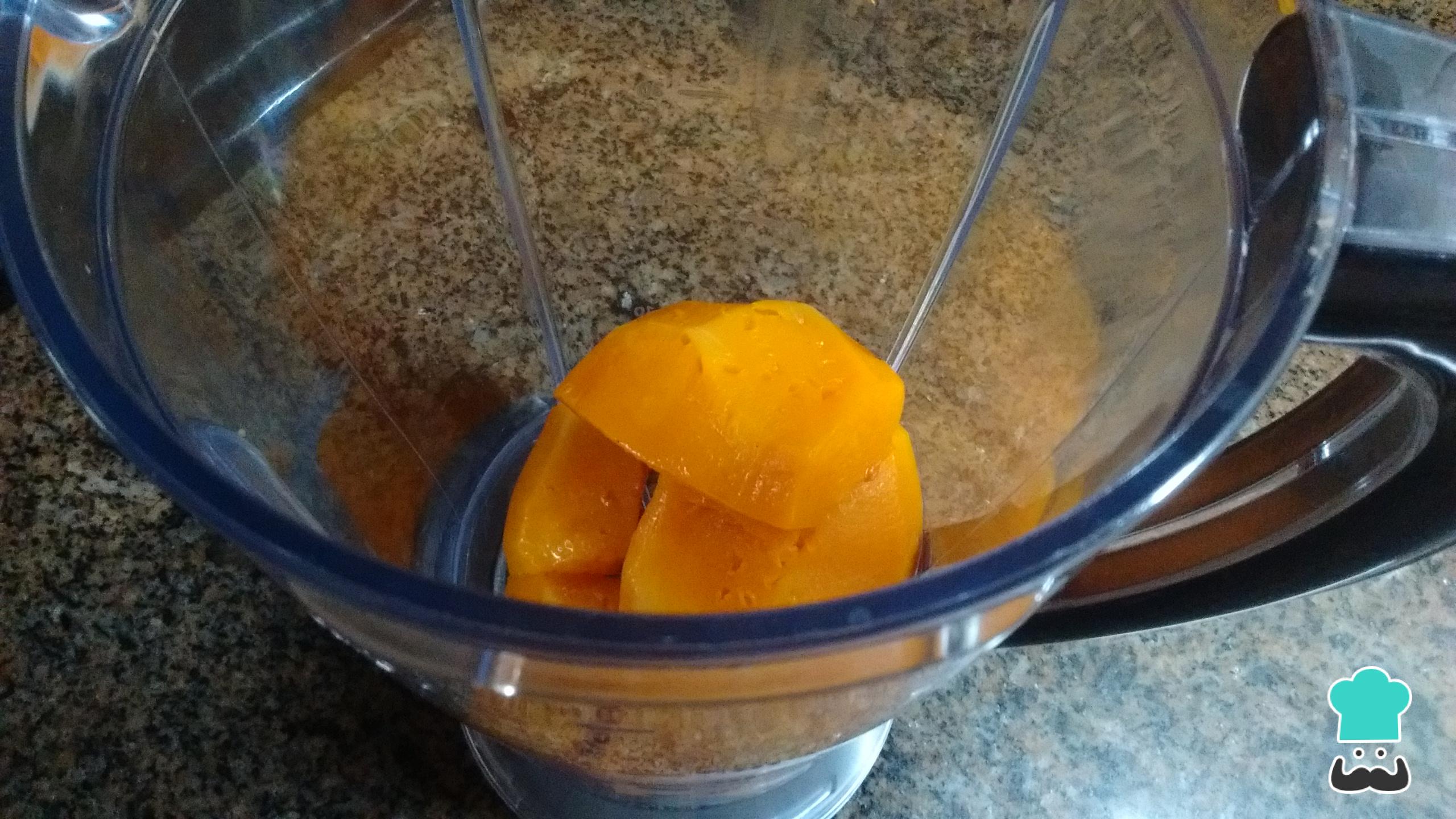 Para empezar con la receta del bizcocho de calabaza de la abuela, primero cocina la calabaza para que luego se enfríe. Puedes elaborarla al microondas durante 15-20 minutos en un recipiente apto y tapado, además de sin piel y cortada en cubos. Luego, debes procesarla hasta obtener un puré liso.