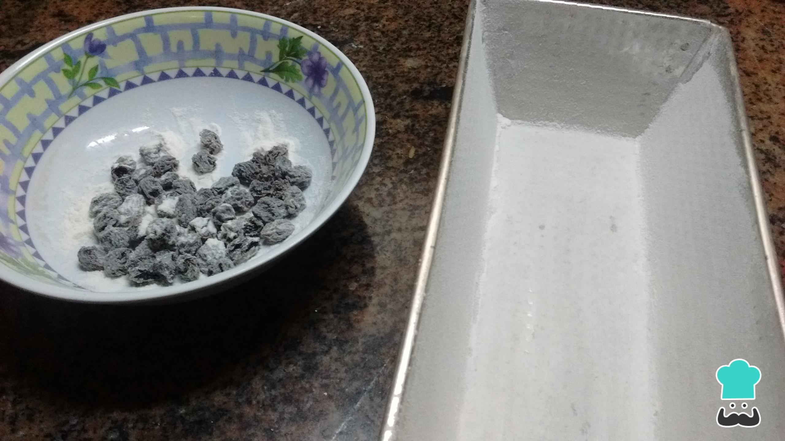 Prepara el molde donde quieras cocinar tu budín. En este caso, es de 24 x 9 x 6 cm. Debe estar previamente engrasado y enharinado. A continuación, mezcla las pasas con una cucharada extra de harina para que no decanten en el fondo durante la cocción.