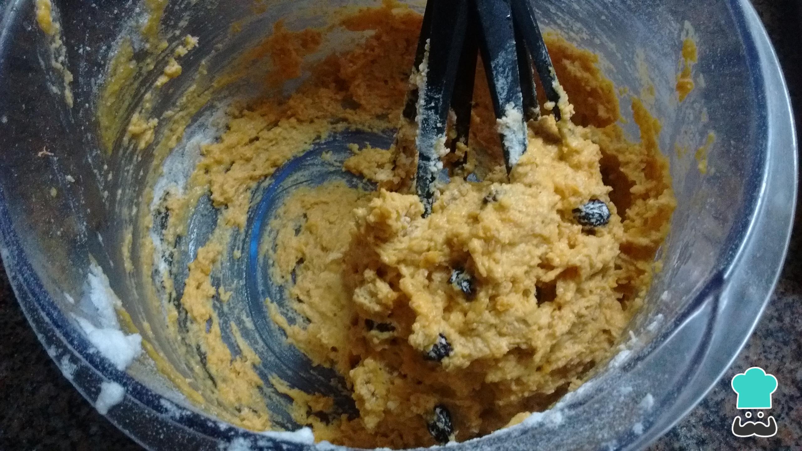 Incorpora los ingredientes secos y las pasas de uva con movimientos envolventes y sin sobrebatir.