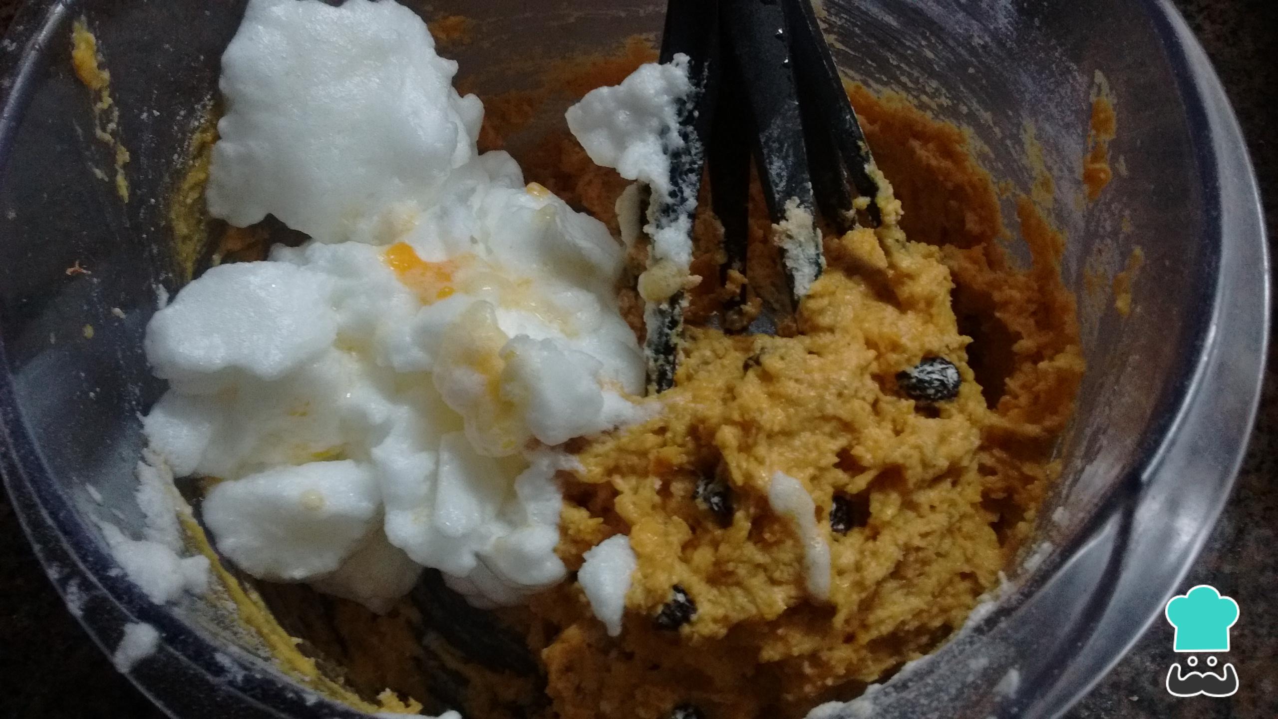 Agrega las claras batidas también con movimientos envolventes y cuidadosos para no bajar el batido del bizcocho de calabaza esponjoso.