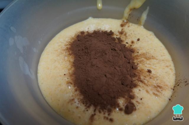 Ahora tienes dos opciones: puedes incorporar el cacao a toda la masa o dividirla en dos para hacer un bizcocho marmolado de calabaza y chocolate. Para la segunda opción, separa la masa en dos recipientes y agrega el cacao en polvo a una de ellas.