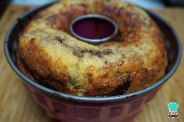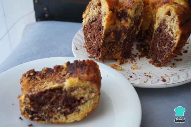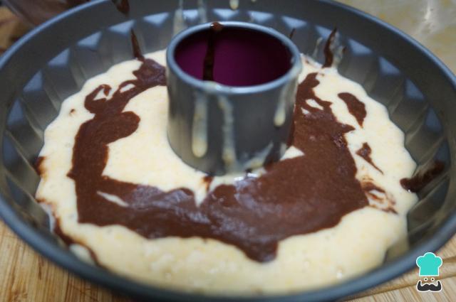 Engrasa un molde con mantequilla o aceite y añade las masas intercalándolas entre sí para que se haga el efecto mármol.