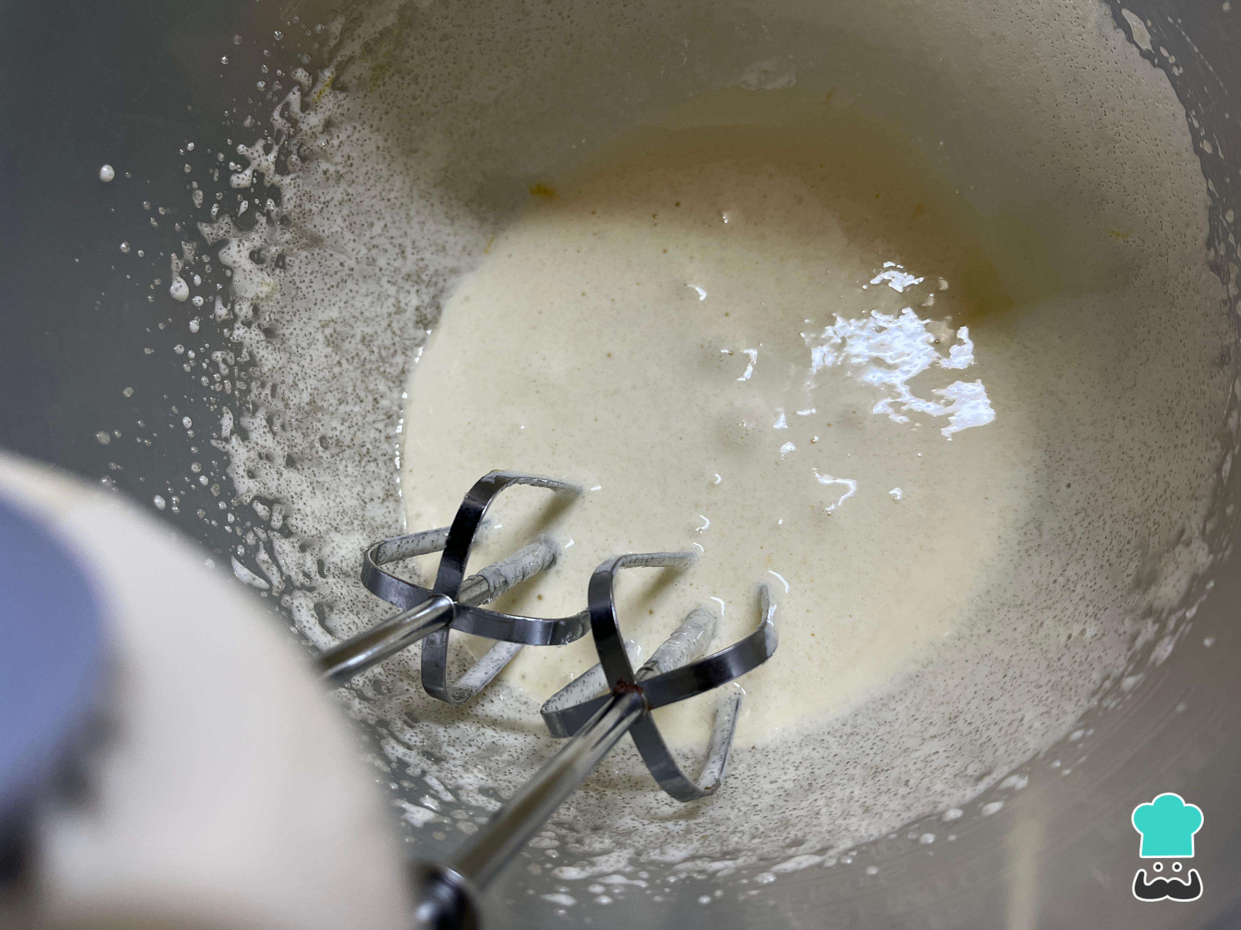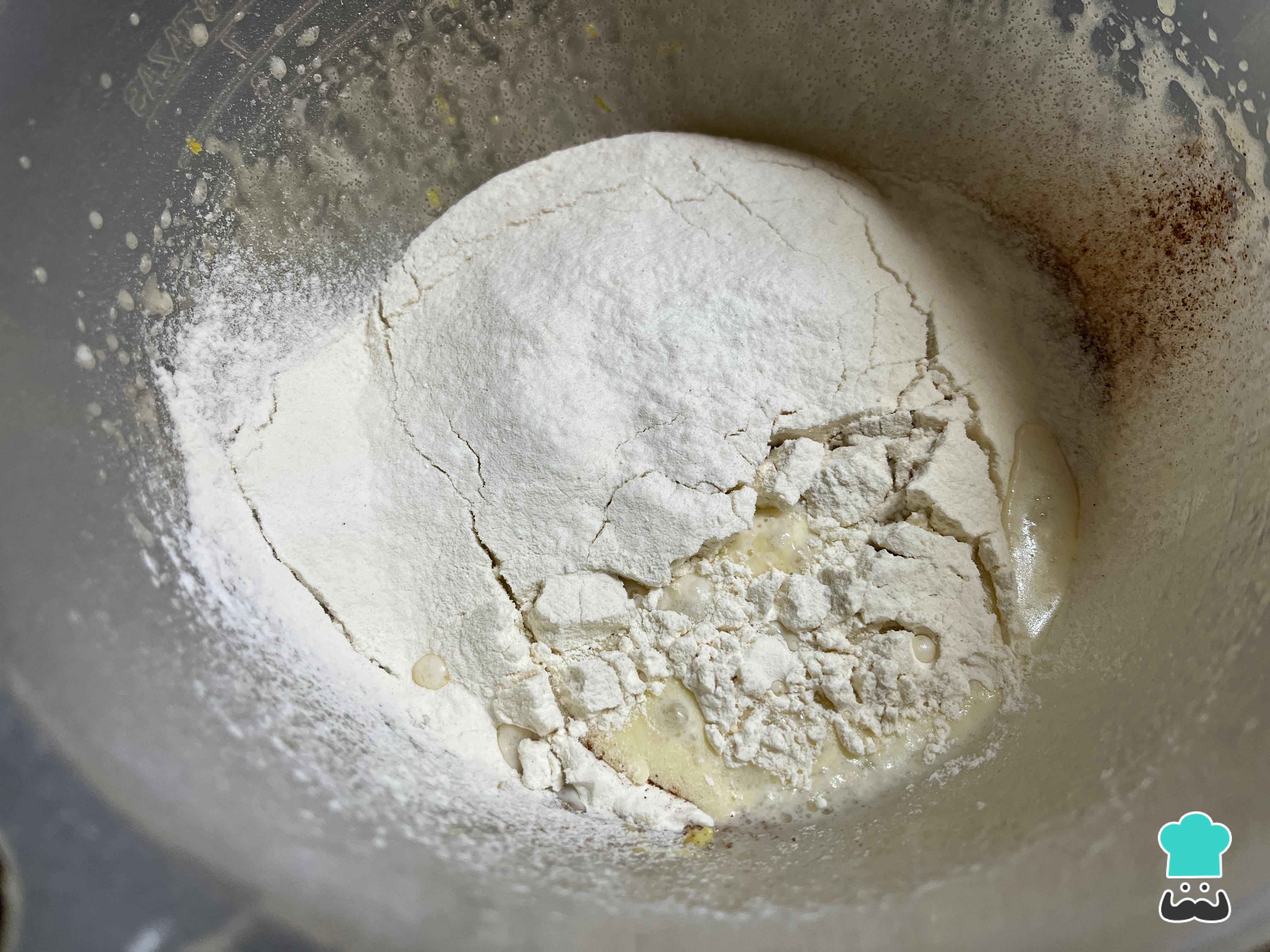 A continuación, agrega la leche y la mitad de la cantidad de harina junto con la canela, el polvo para hornear y el bicarbonato de sodio. Si lo deseas, puedes reemplazar la harina por leudante. En ese caso, solo deberás agregar el bicarbonato de sodio, ya que el polvo para hornear está incluído en esta harina. También, puedes reemplazar la leche por agua o jugo de limón. Bate solo unos segundos hasta para integrar los ingredientes.