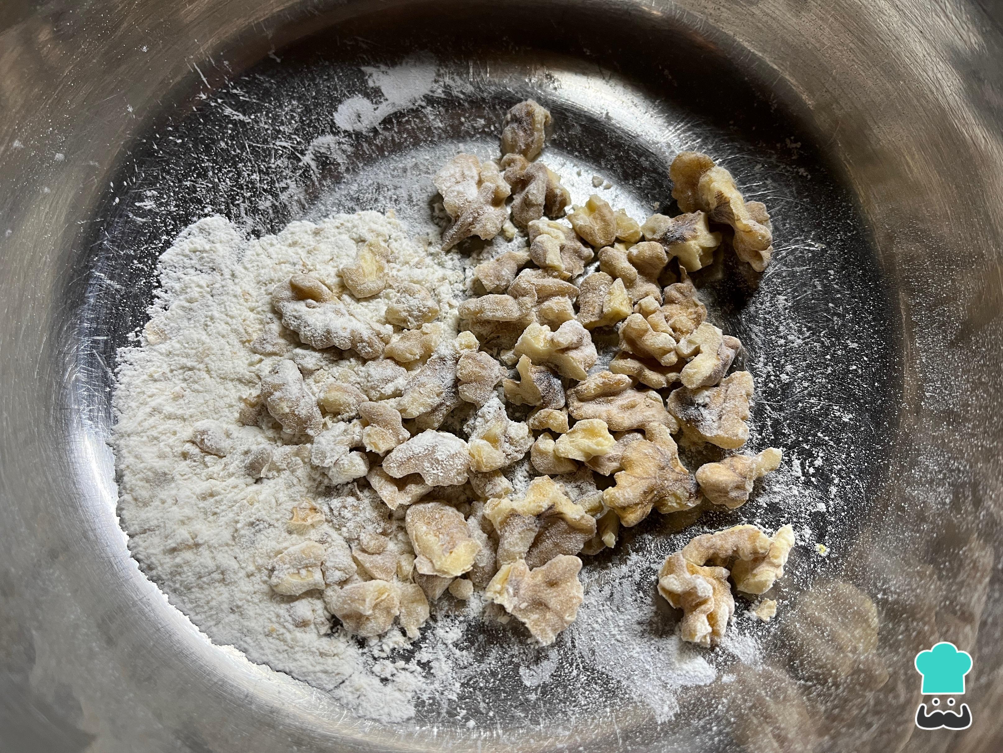 Mezcla una cucharada de la harina restante con las nueces picadas. Esto hará que se repartan de forma equilibrada por todo el bizcocho, en lugar de decantar en el fondo durante la cocción.