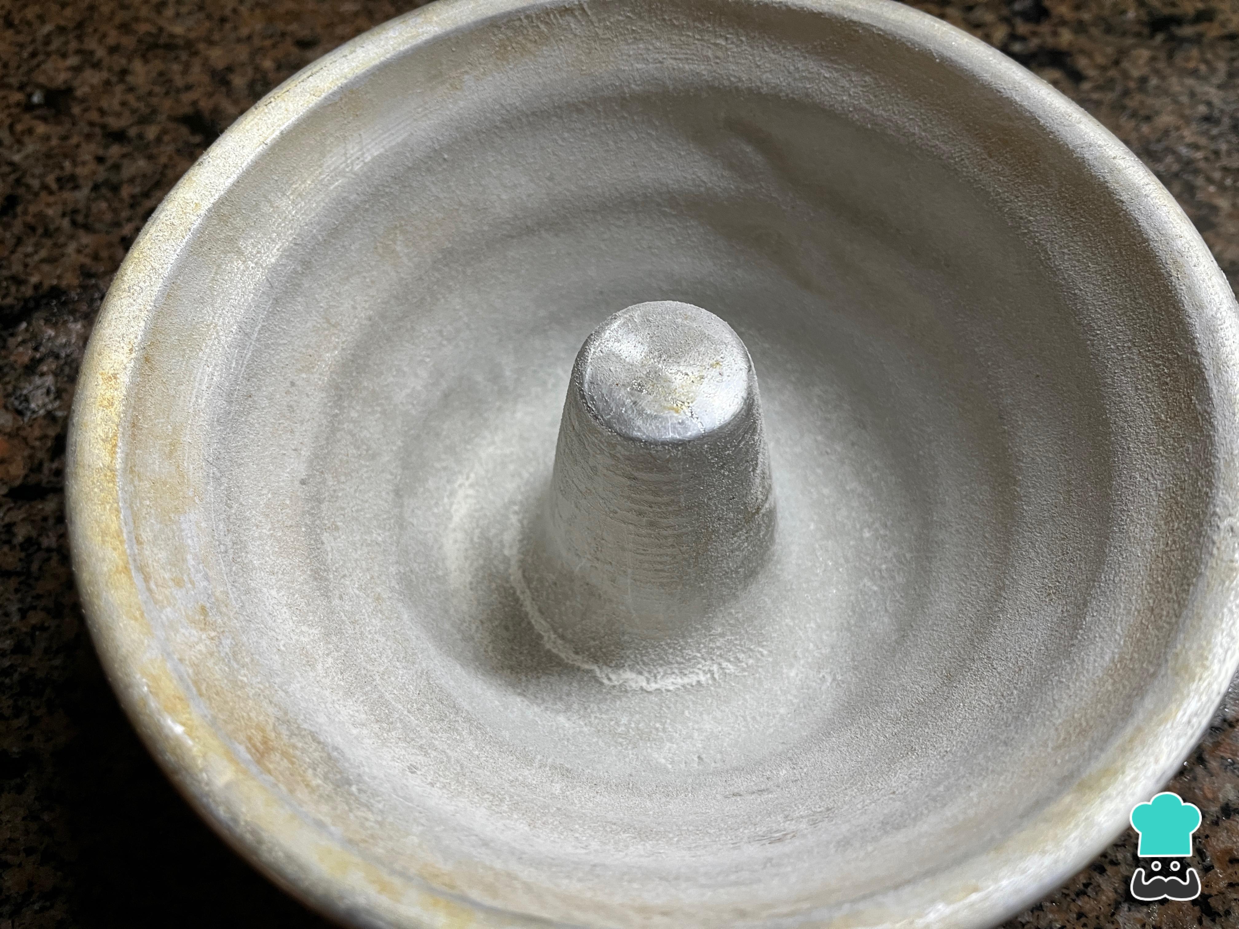 Prepara el molde donde deseas cocinar tu budín, engrasándolo con aceite o manteca y enharinándolo. En este caso, es un molde savarín de 16 centímetros de diámetro. Puedes usar uno estilo inglés de 24 x 9 x 6 cm o uno desmontable de bizcocho de 16 centímetros de diámetro. También puedes adaptar las cantidades a un molde más grande. Enciende el horno a 180 ºC para precalentarlo.