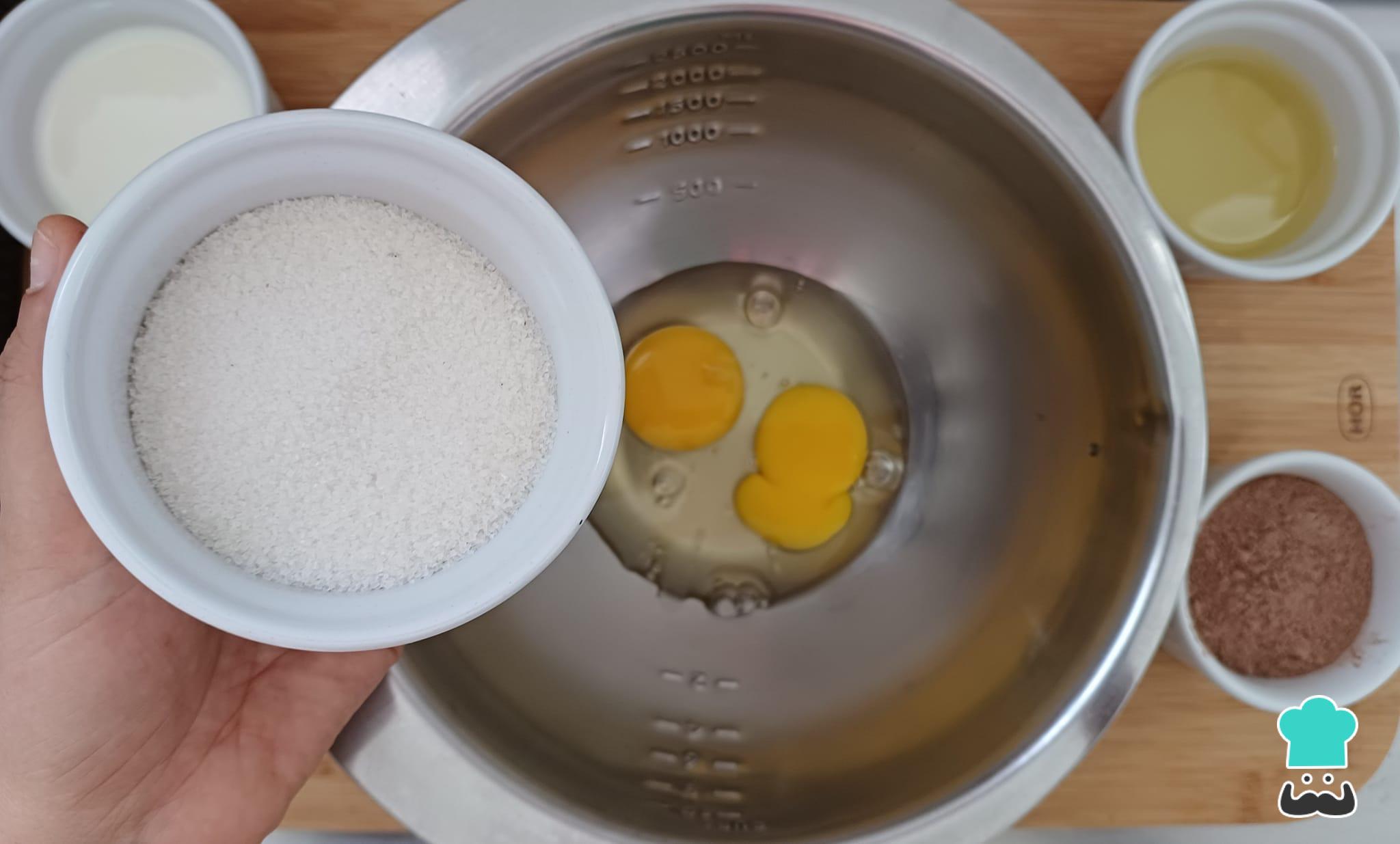 En un bol agrega los huevos y el azúcar, batiendo con unas varillas hasta formar una crema.