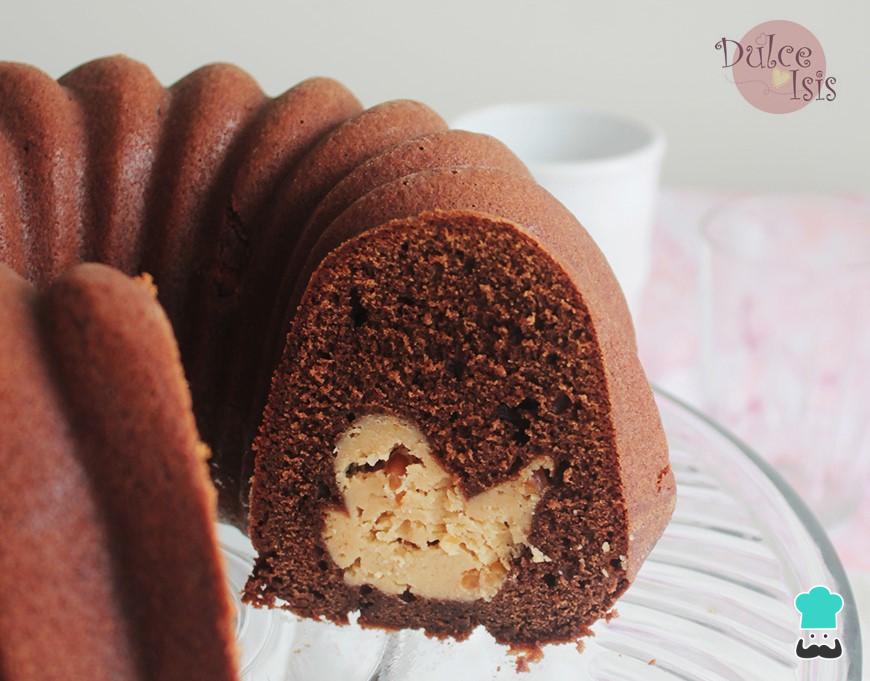 ¡Hola! desde Dulce Isis les comparto una receta deliciosa y original. Se trata de un bundt cake de chocolate relleno con nada menos que cheesecake de mantequilla de maní o cacahuate, que es como lo conocen en otras partes.