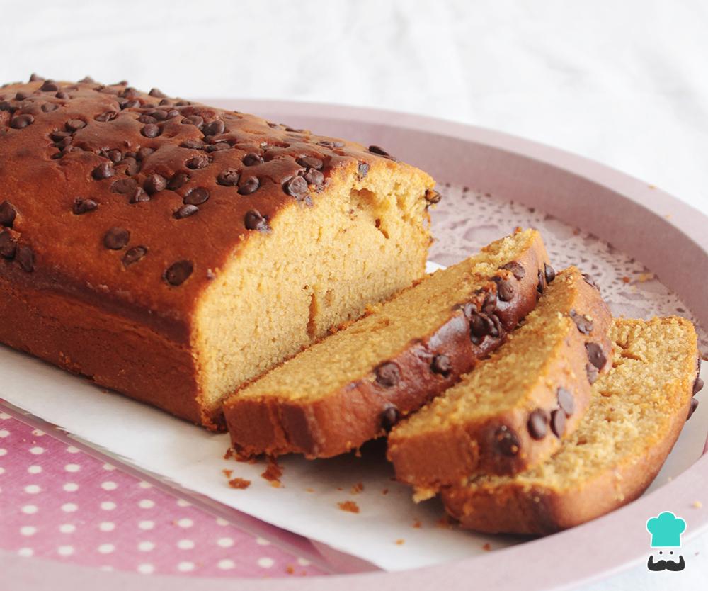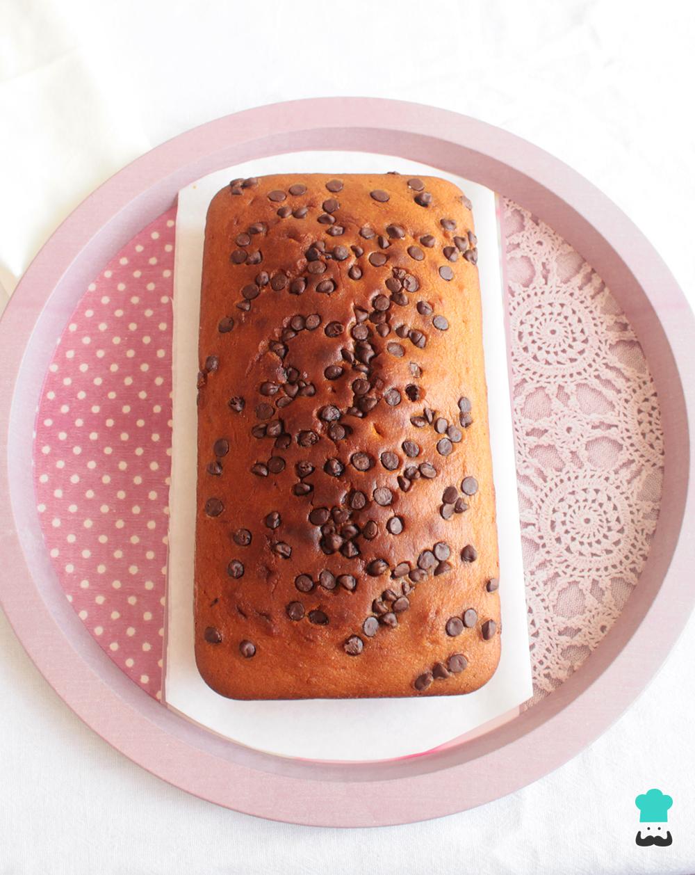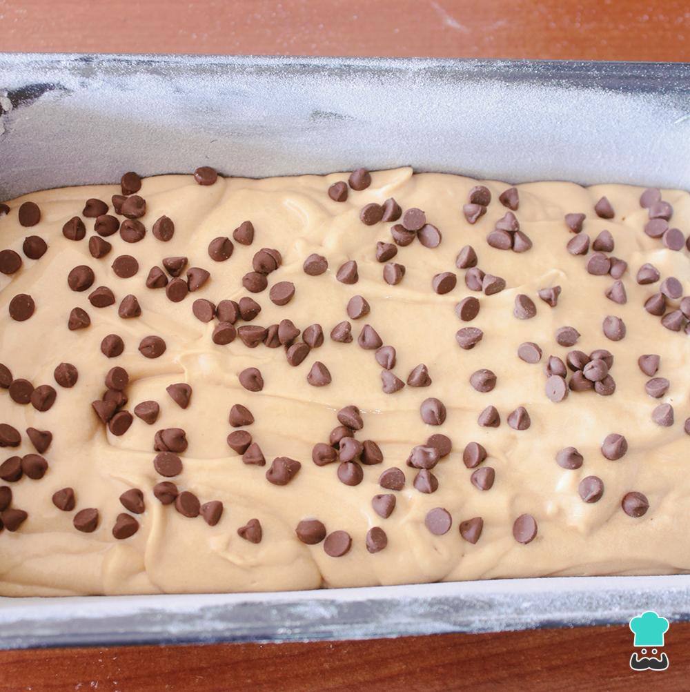 Verter la mezcla en un molde rectangular previamente engrasado con mantequilla y espolvoreado con harina. Y ya para terminar, añade unas cuantas chispas de chocolate por toda la superficie.