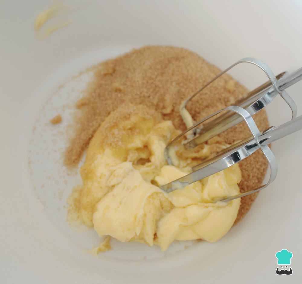 En otro bol nos ponemos a batir la mantequilla con el azúcar hasta que esté cremosa, esto lo conseguiremos después de uno o dos minutos. Recuerda que la mantequilla debe estar a temperatura ambiente, nunca fría de la nevera.