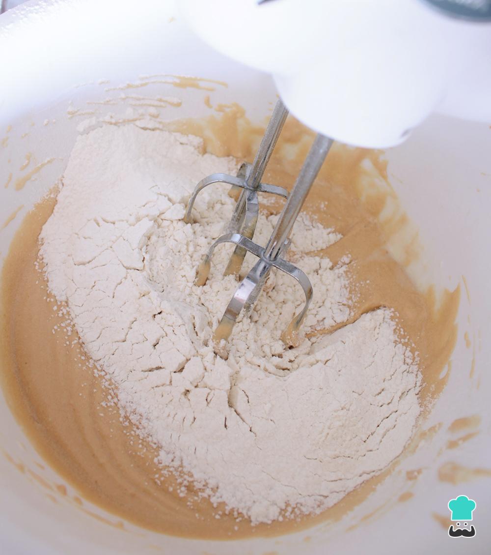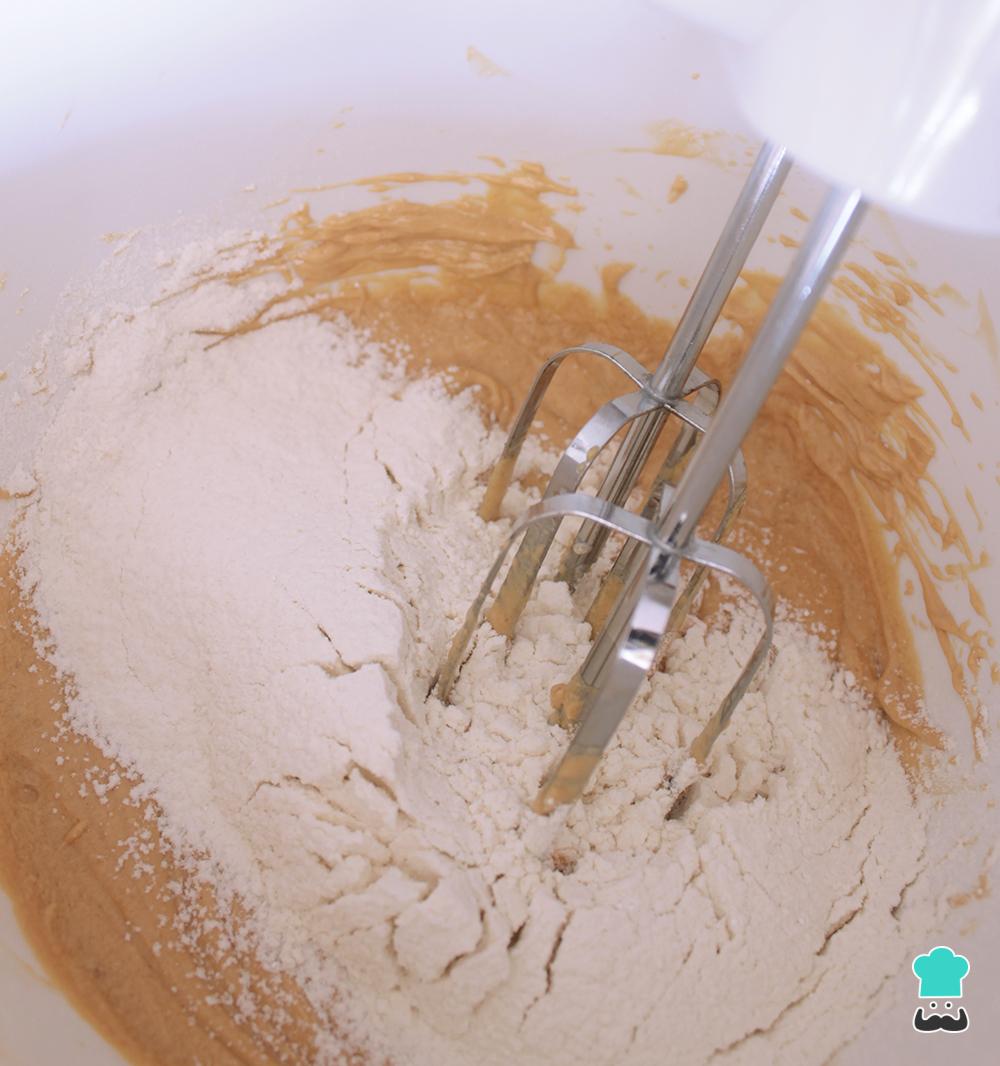 A continuación, añadir la mitad de los ingredientes secos y seguir batiendo hasta integrar. Una vez que se agrega la harina a la masa, debemos batir muy suavemente para que no se endurezca la mezcla.