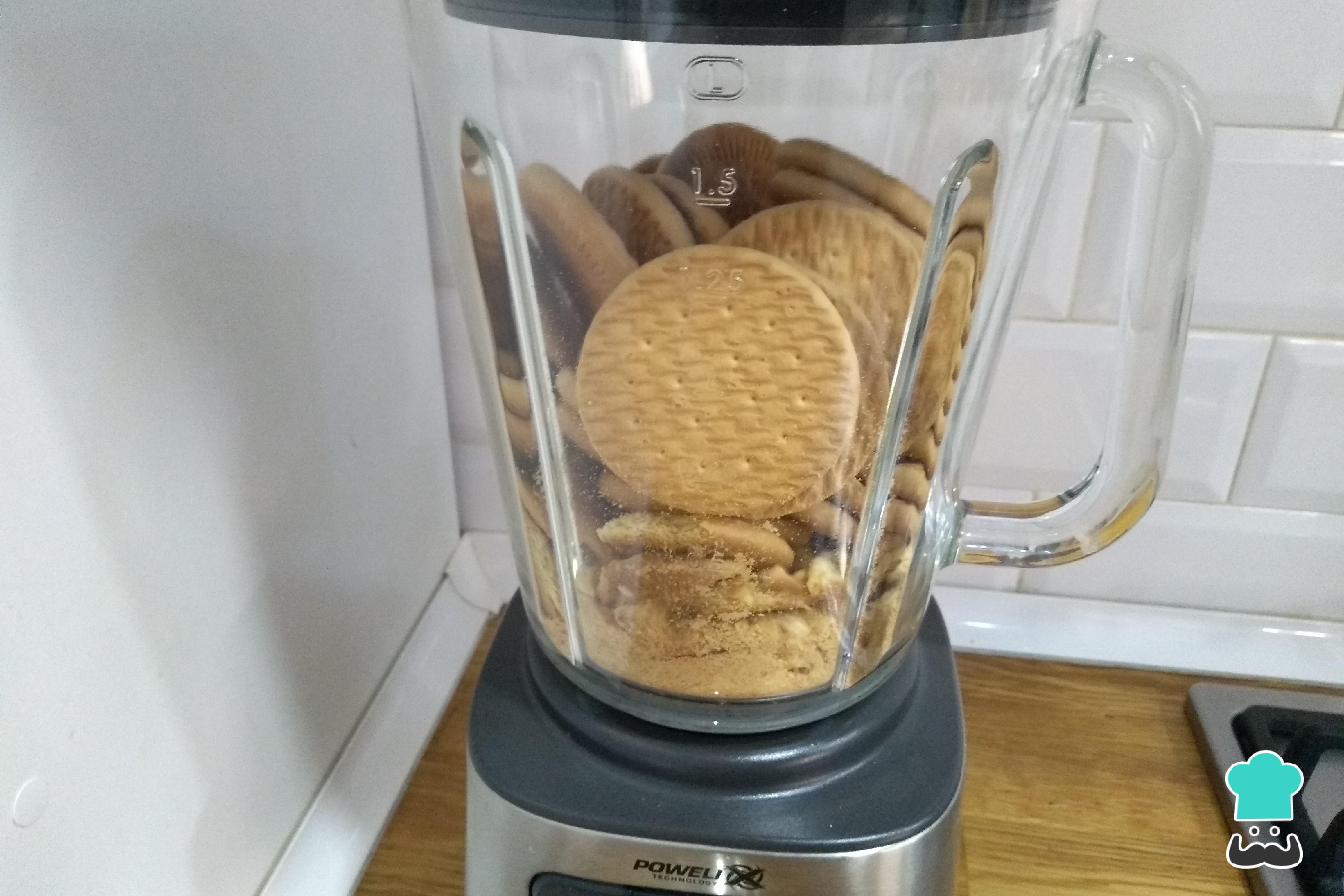 Tritura las galletas. Para ello, puedes usar un robot de cocina o introducirlas en una bolsa, cerrarla y golpearla con un rodillo. El resultado debe ser harina de galleta, de manera que deben quedar totalmente pulverizadas. Reserva para después.