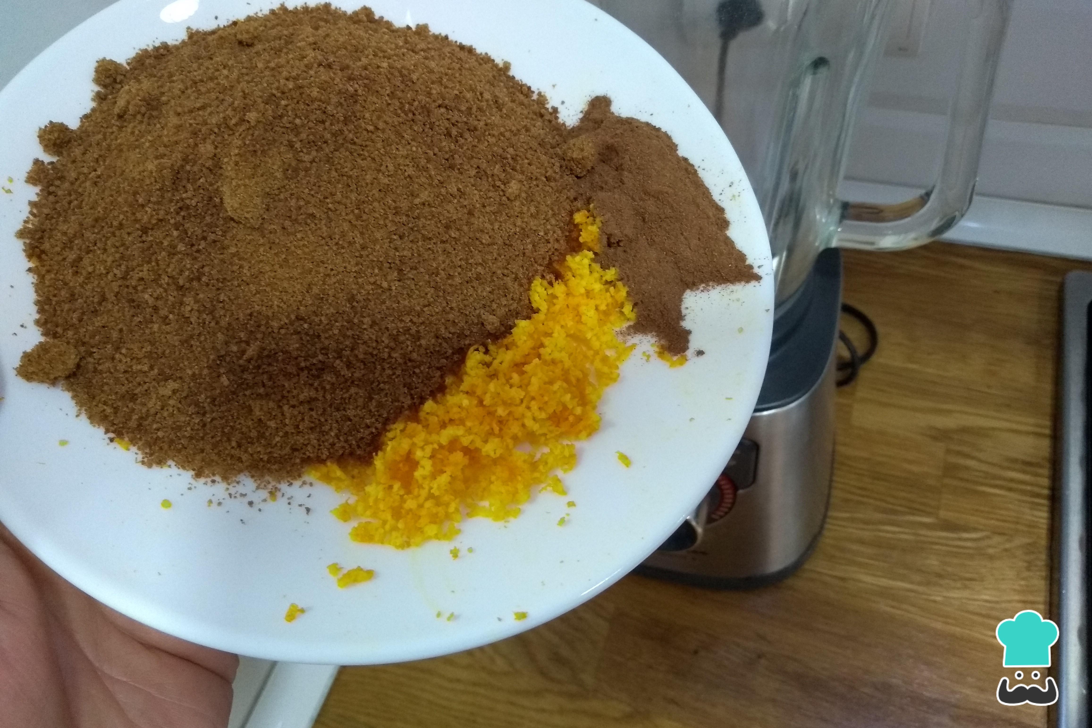 Aparte, mezcla el azúcar con la ralladura de naranja y la canela. Introduce esta mezcla en la licuadora o el vaso de la batidora y tritura durante 3 minutos. Este es otro de los trucos para conseguir un bizcocho de galleta esponjoso. Al no llevar harina, es muy importante que los ingredientes secos queden lo más finos posible.