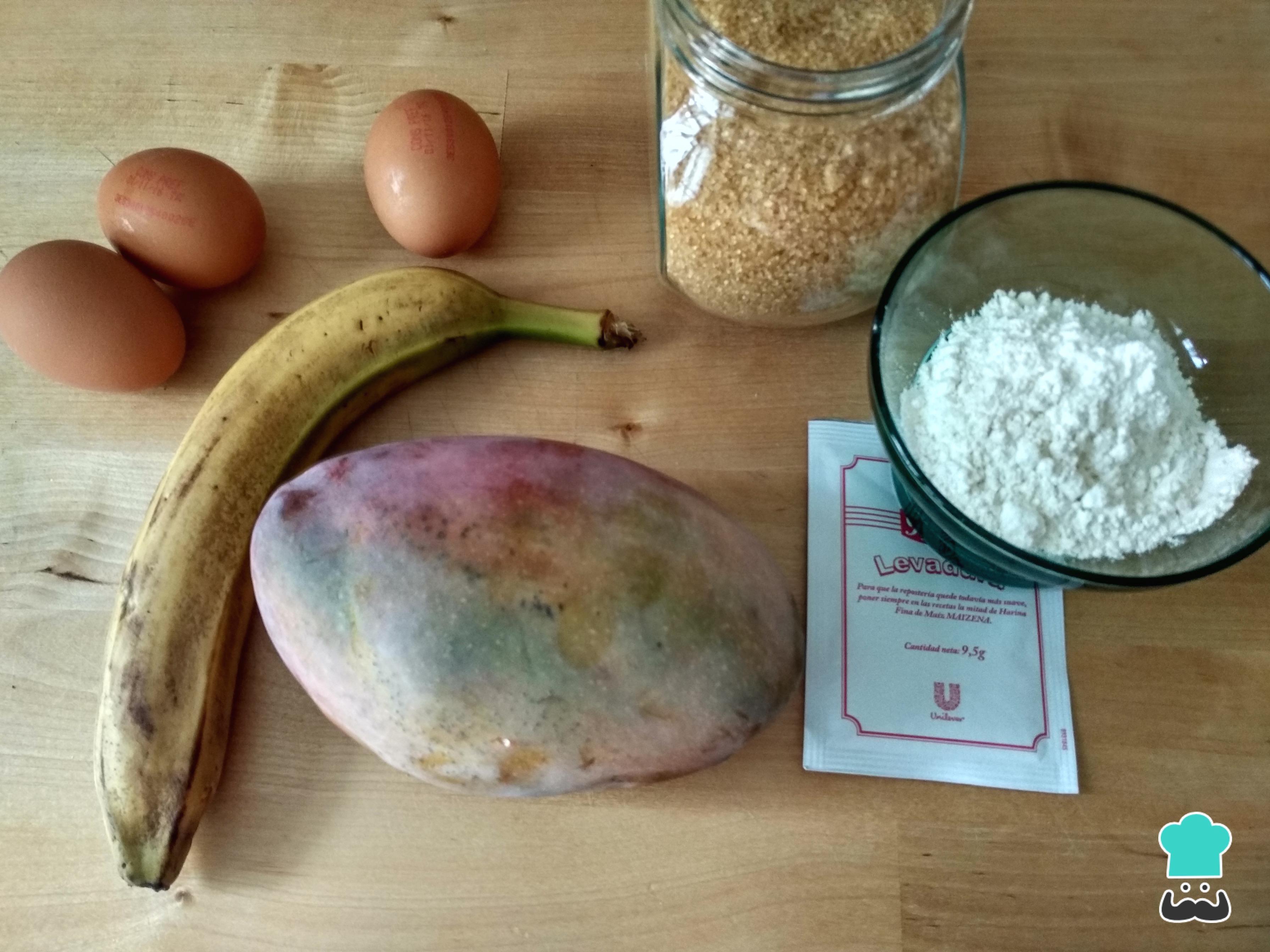 Reunimos todos los ingredientes para elaborar el bizcocho sin leche de mango y plátano.