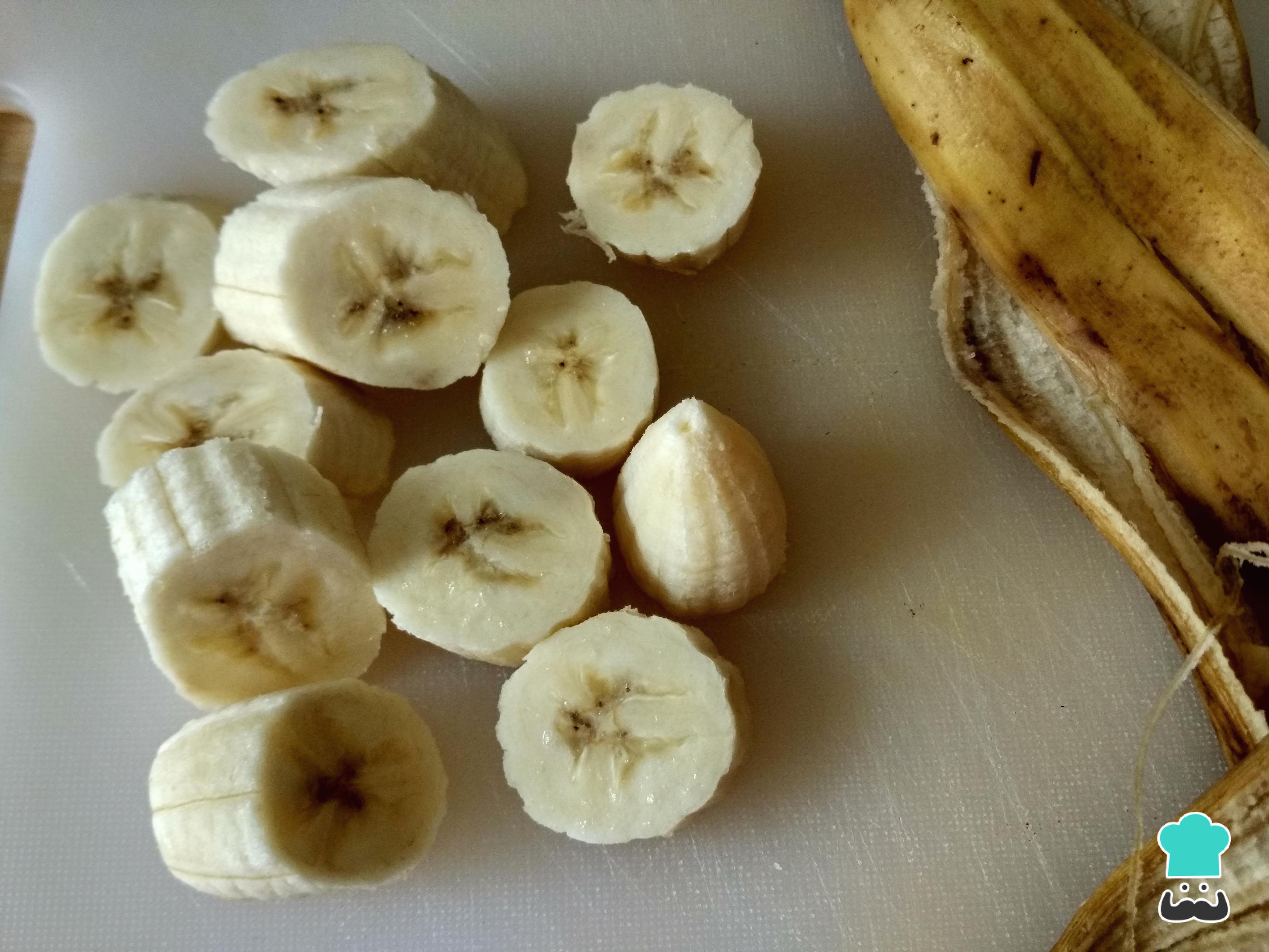 En primer lugar, pelamos el plátano y el mango, y los troceamos.