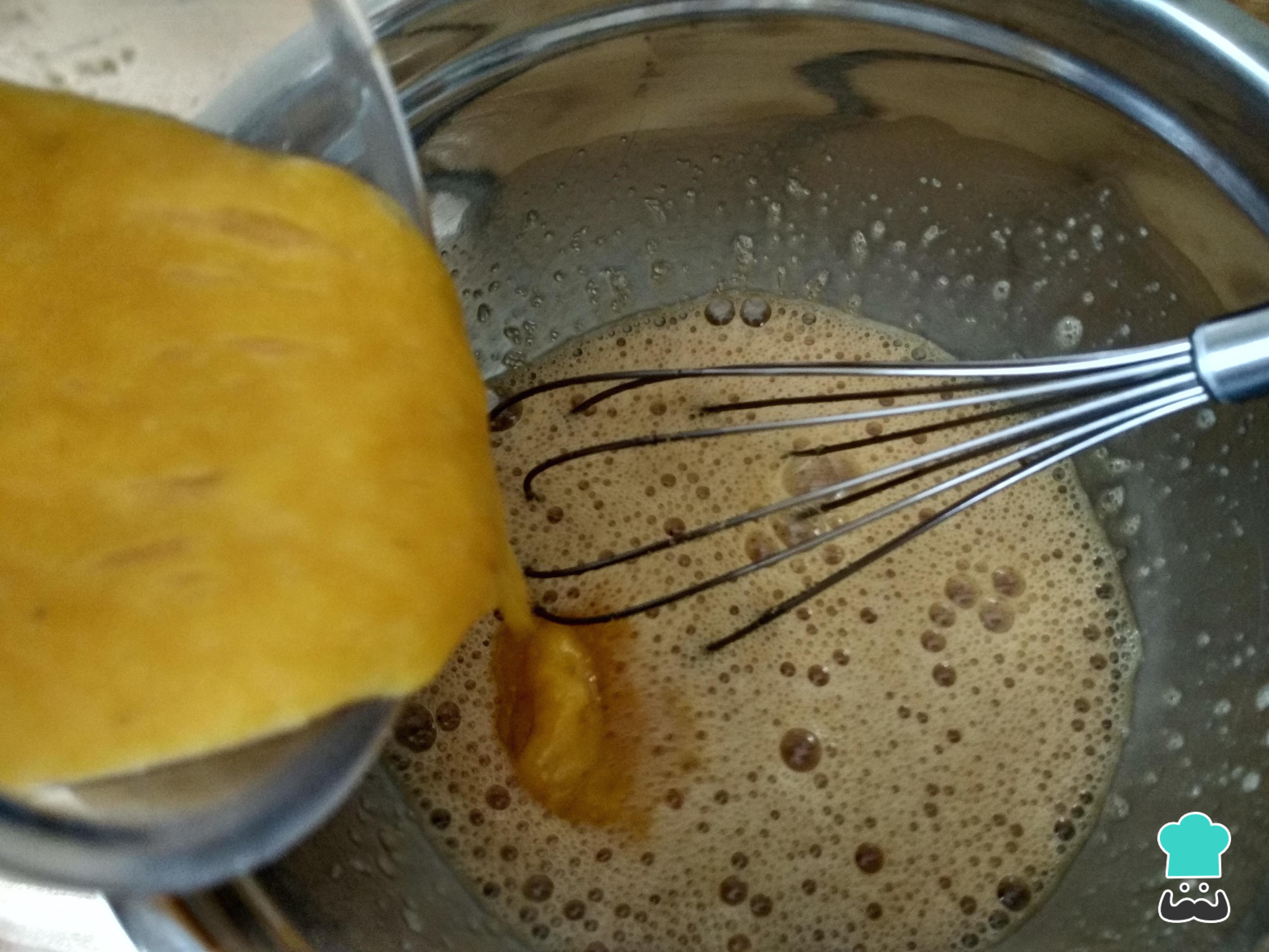 Para continuar con la torta casera, agregamos el puré de mango y plátano y seguimos batiendo con las varillas.