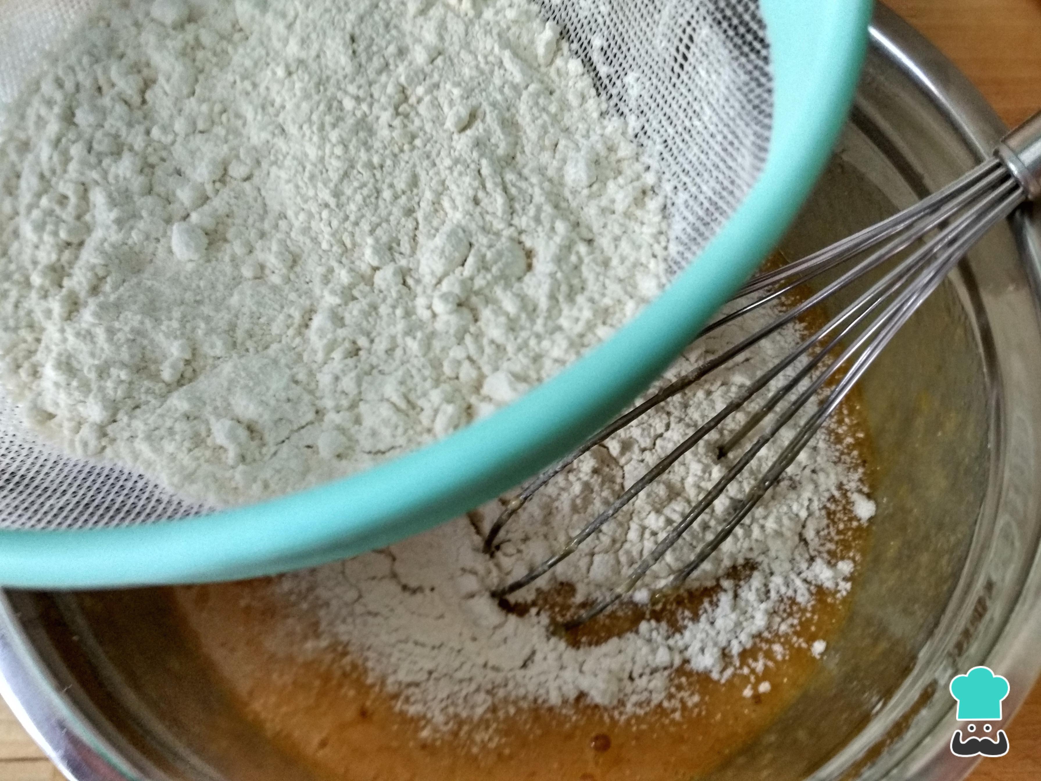 Por último, añadimos la harina y la levadura tamizadas. Mezclamos poco a poco con las varillas hasta que la harina se integre por completo.