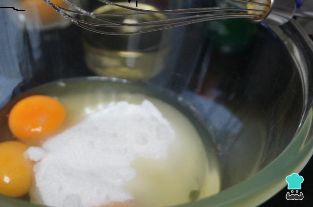 En un bol, pondremos los huevos y el azúcar y batiremos hasta que queden bien espumosos.