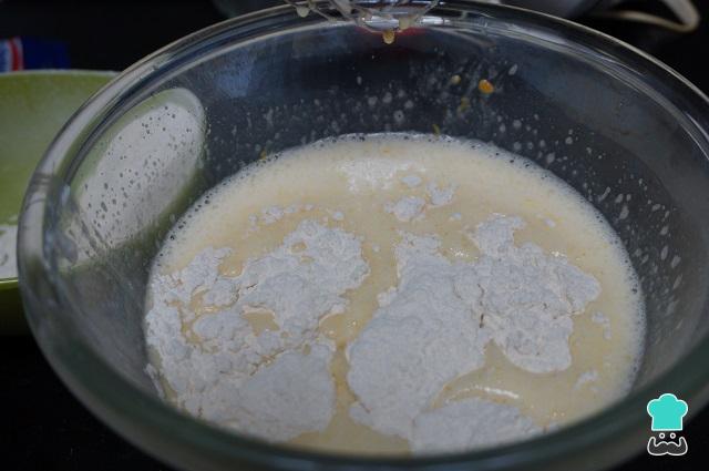 Tamizamos la harina junto con la levadura y las vamos echando al bol que tenemos con la masa del bizcocho de naranja, y las mezclamos poco a poco.