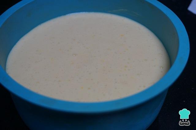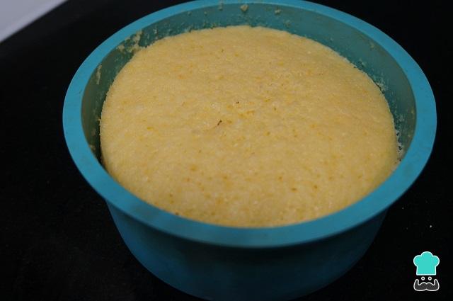 Cogeos un molde apto para microondas, lo untamos con un poco de mantequilla, y ponemos toda la masa del bizcocho de naranja.
