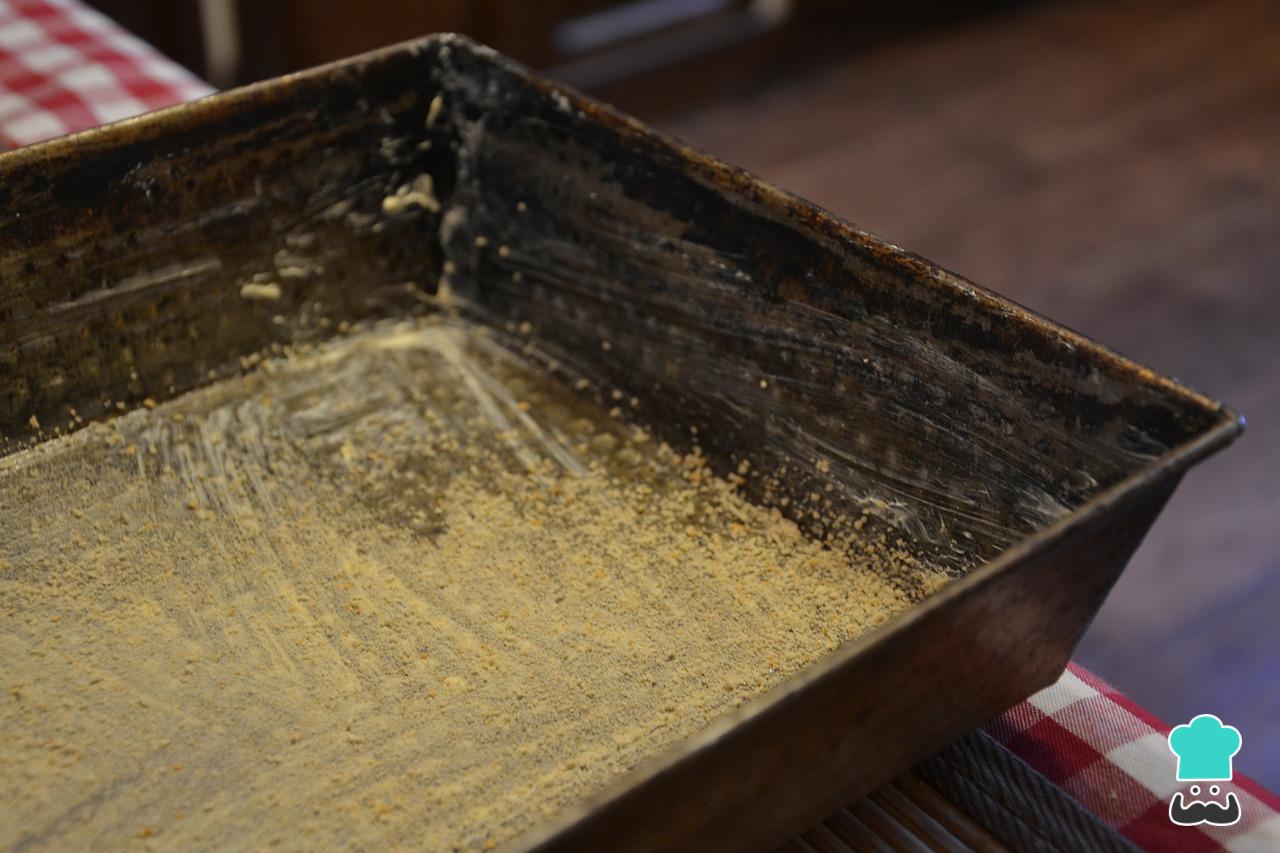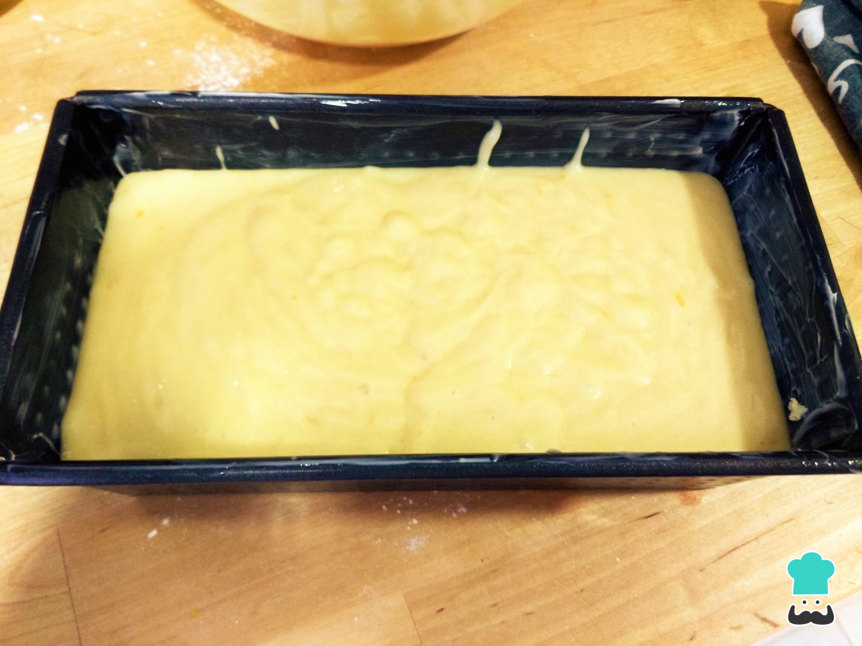 Termina de mezclar con ayuda de la espátula la masa del bizcocho de naranja y chocolate fácil. Luego engrasa un molde de plum-cake con mantequilla y enharínalo ligeramente.
