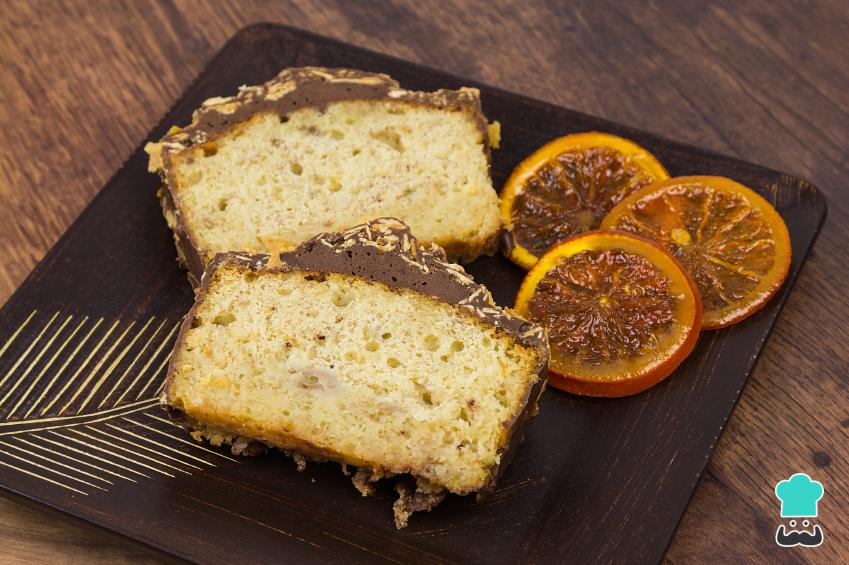Desmolda el bizcocho de naranja sobre una rejilla y cúbrelo con la cobertura de chocolate.