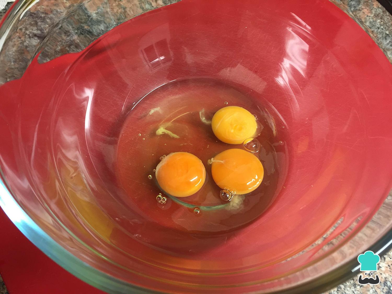 Cuando lo tenemos todo listo, cogemos un bol y colocamos los tres huevos. Si disponemos de licuadora, también podemos usarla.
