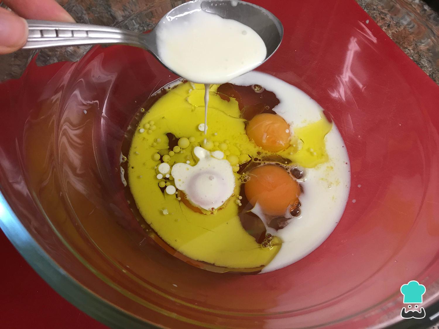Luego, vertemos sobre los huevos el aceite, la leche y la crema de leche o nata para montar. Para medir las cantidades, nosotros hemos utilizado una cuchara sopera común.