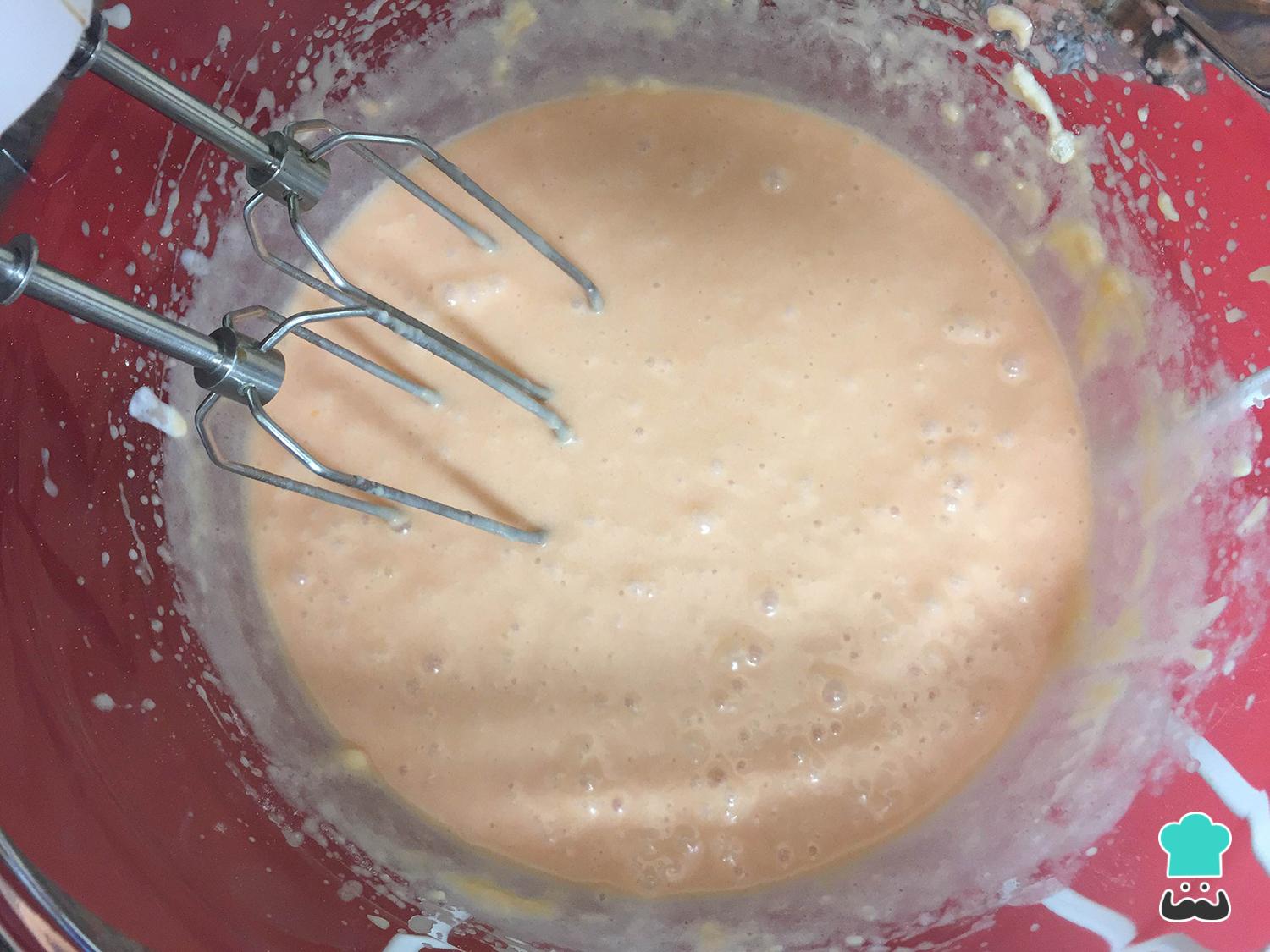 Mezclamos todos los ingredientes con unas varillas eléctricas o manuales. Como comentamos en el primer paso, si disponemos de licuadora también podemos añadir todos los productos al vaso y mezclar hasta obtener una preparación homogénea y sin grumos.