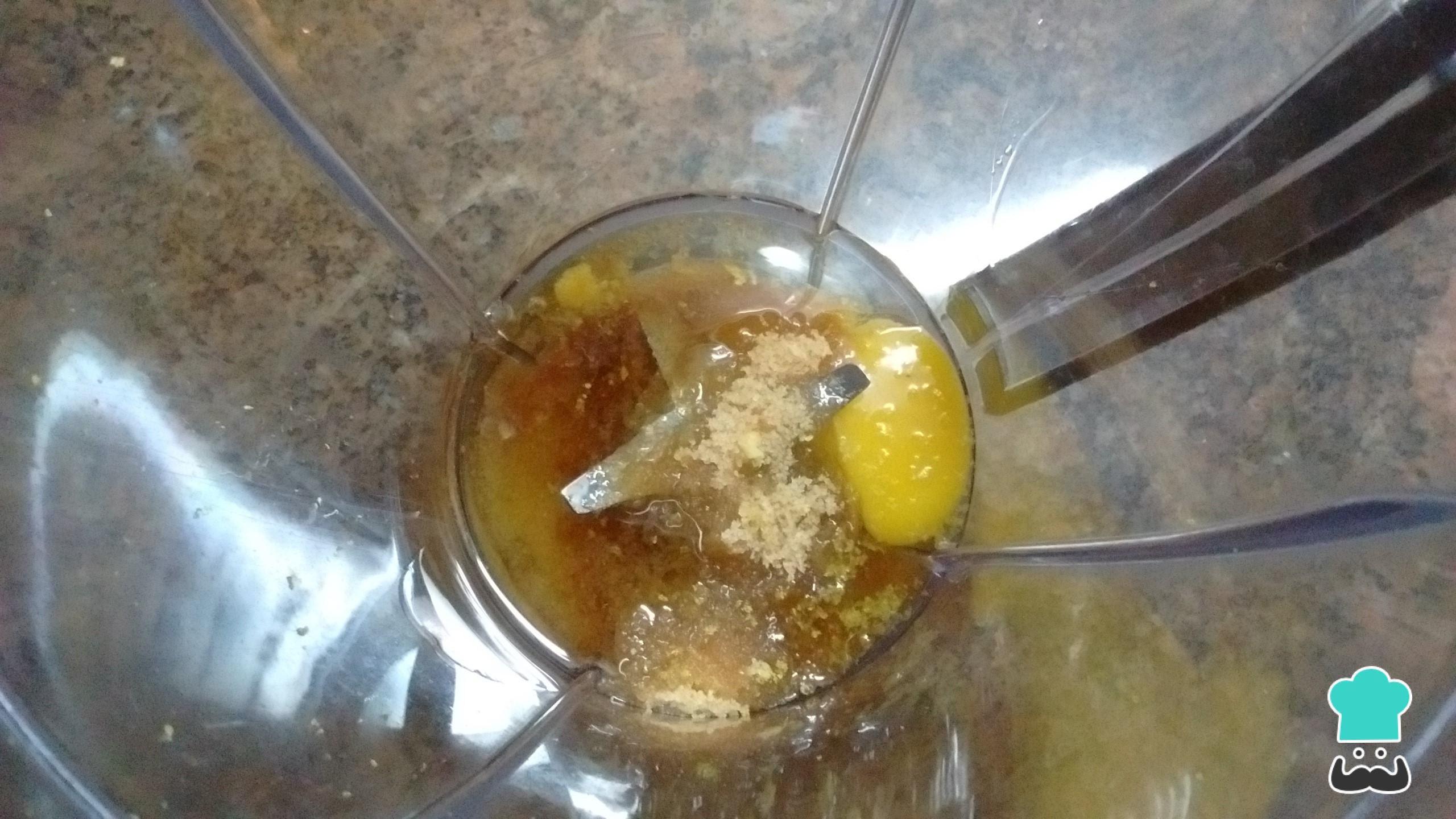 Por otro lado, dispón el huevo junto con la pizca de sal, el azúcar mascabo y el aceite en una procesadora. Enciéndela hasta que esté bien blanquecino y esponjoso.