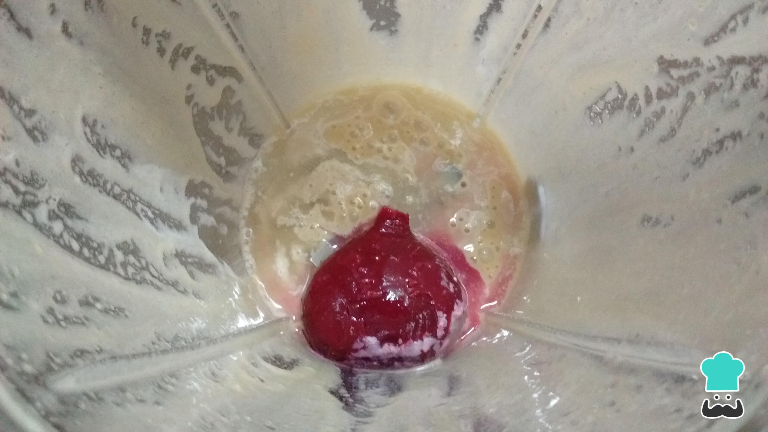Agrega la remolacha ya cocida y fría, sin su tallo ni piel. También añade medio limón cortado en gajos a vivo, es decir, sin la parte blanca de la piel. Puedes agregar un poco de su cáscara rallada si deseas un sabor alimonado más intenso. Procesa hasta obtener una preparación homogenea, sin pedacitos de remolacha entera.