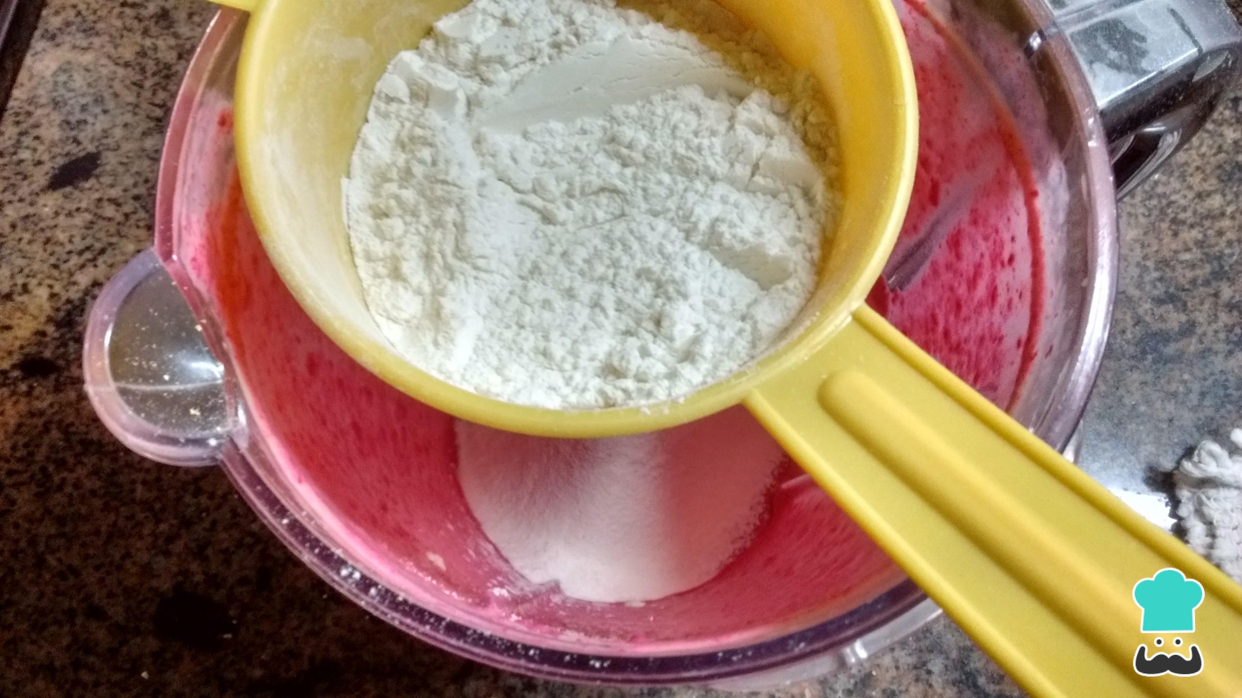Añade la mitad de la harina, tamizándola previamente, junto con el polvo para hornear. Agrega también la mitad de la leche. Ciérrala bien, dale unos toques a la licuadora y agrega el resto, cuidando la cantidad de leche.