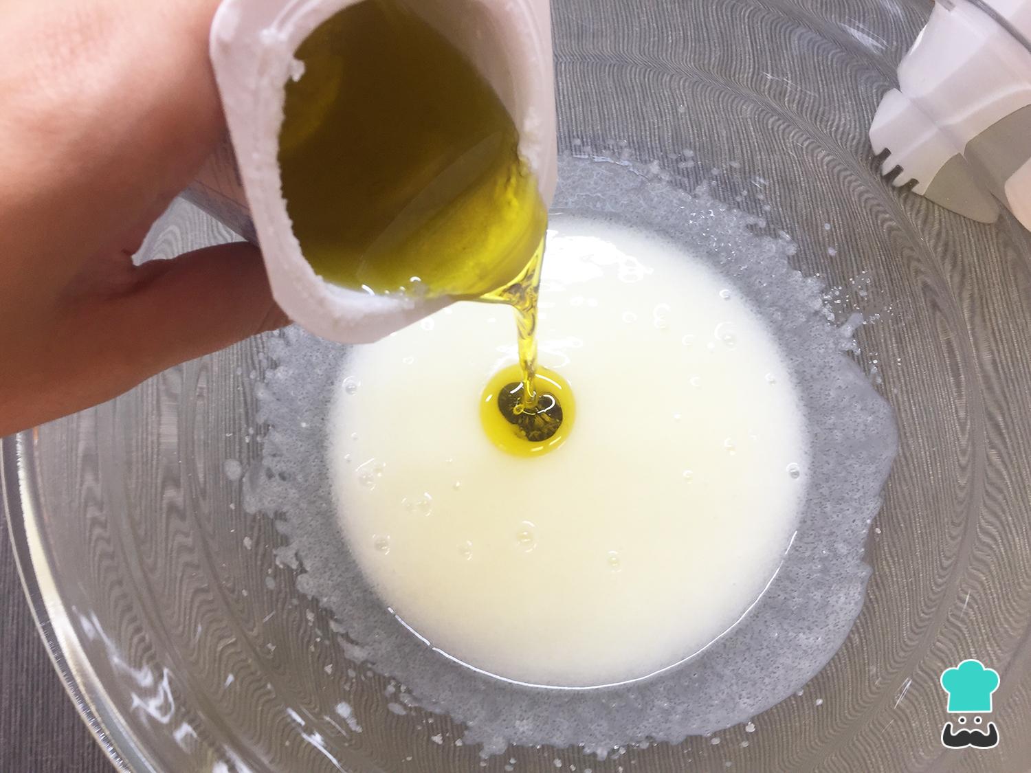 Antes de empezar con la preparación del bizcocho de yogur esponjoso, es fundamental que la medida en vaso de todos los ingredientes la tomes con el envase del yogur vacío. Teniendo esto en cuenta, empieza por batir los huevos con una batidora e incorpora poco a poco el aceite, el yogur y el azúcar.