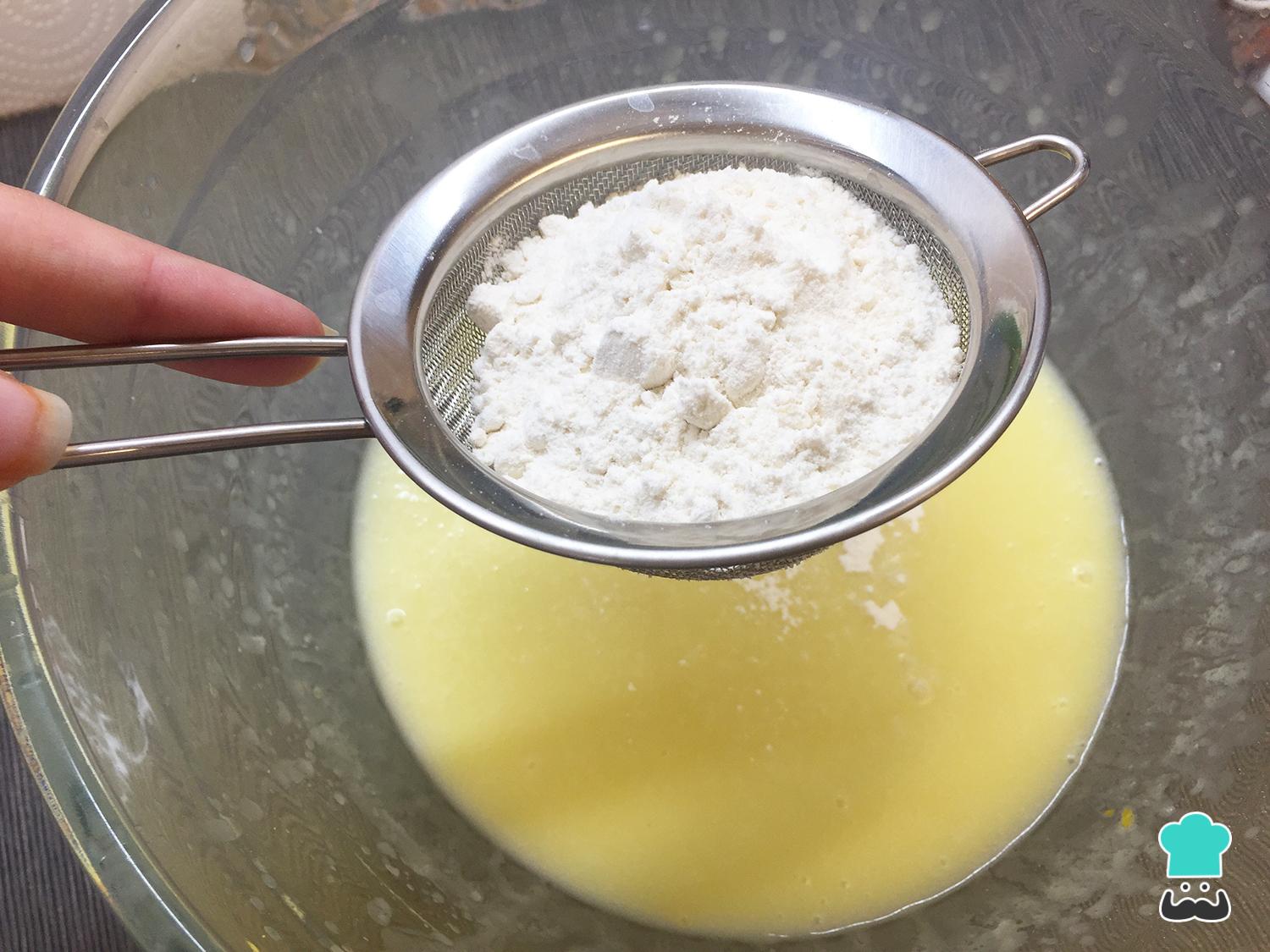 - La harina debe tamizarse para airearla y lograr una masa más suave, lo que se traducirá en un bizcocho más esponjoso.