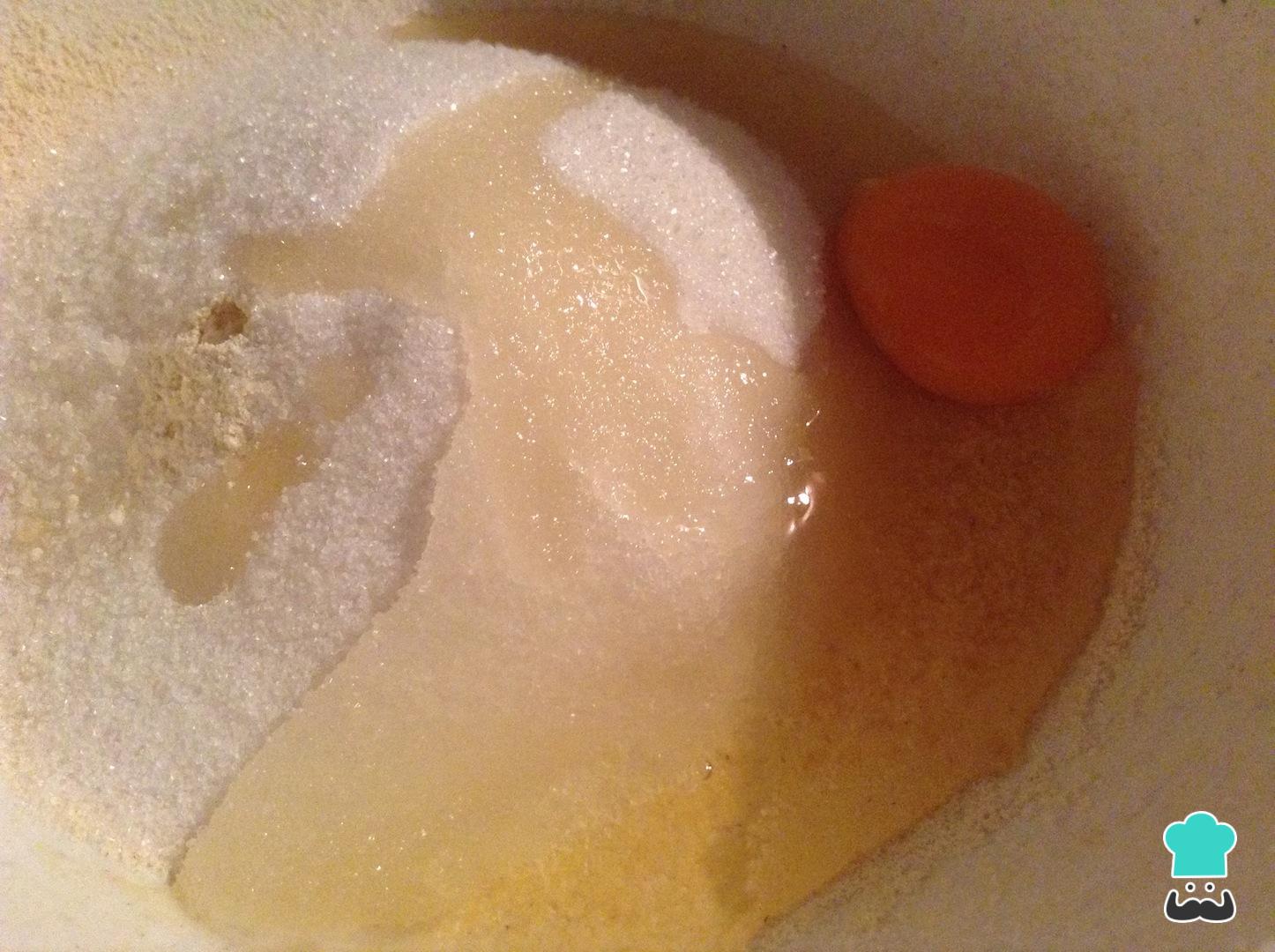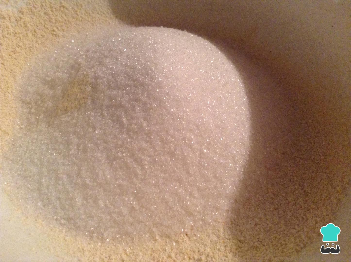 En un bol, debemos pasar por un colador la harina de maíz para tamizarla y obtener una preparación más fina. Luego, la mezclamos con el azúcar.