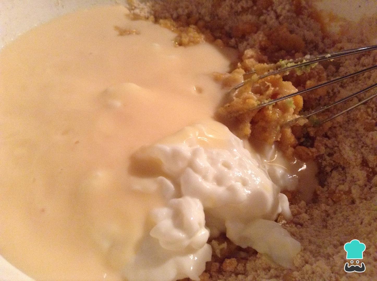 Añade el yogur natural, la ralladura de limón y el yogur de melocotón, o el que haya sido de tu preferencia. Mezcla muy bien todos los ingredientes hasta obtener una masa homogénea y sin grumos.
