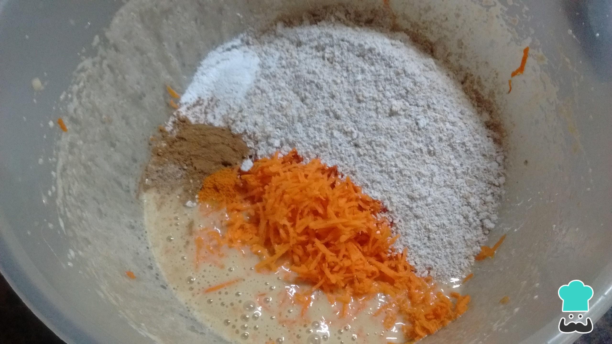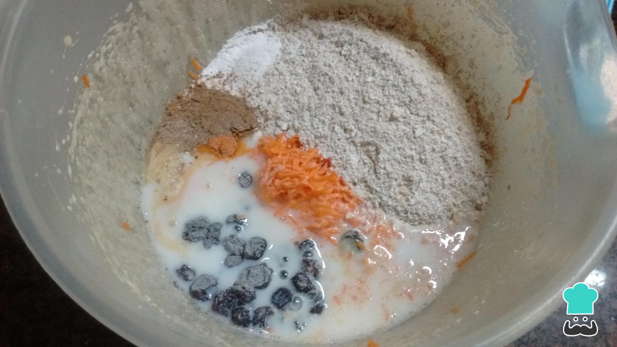 Procesa la avena para lograr una consistencia similar a la harina. Agrégala al batido junto con la leche, los condimentos, el polvo para hornear y la zanahoria rallada fina.