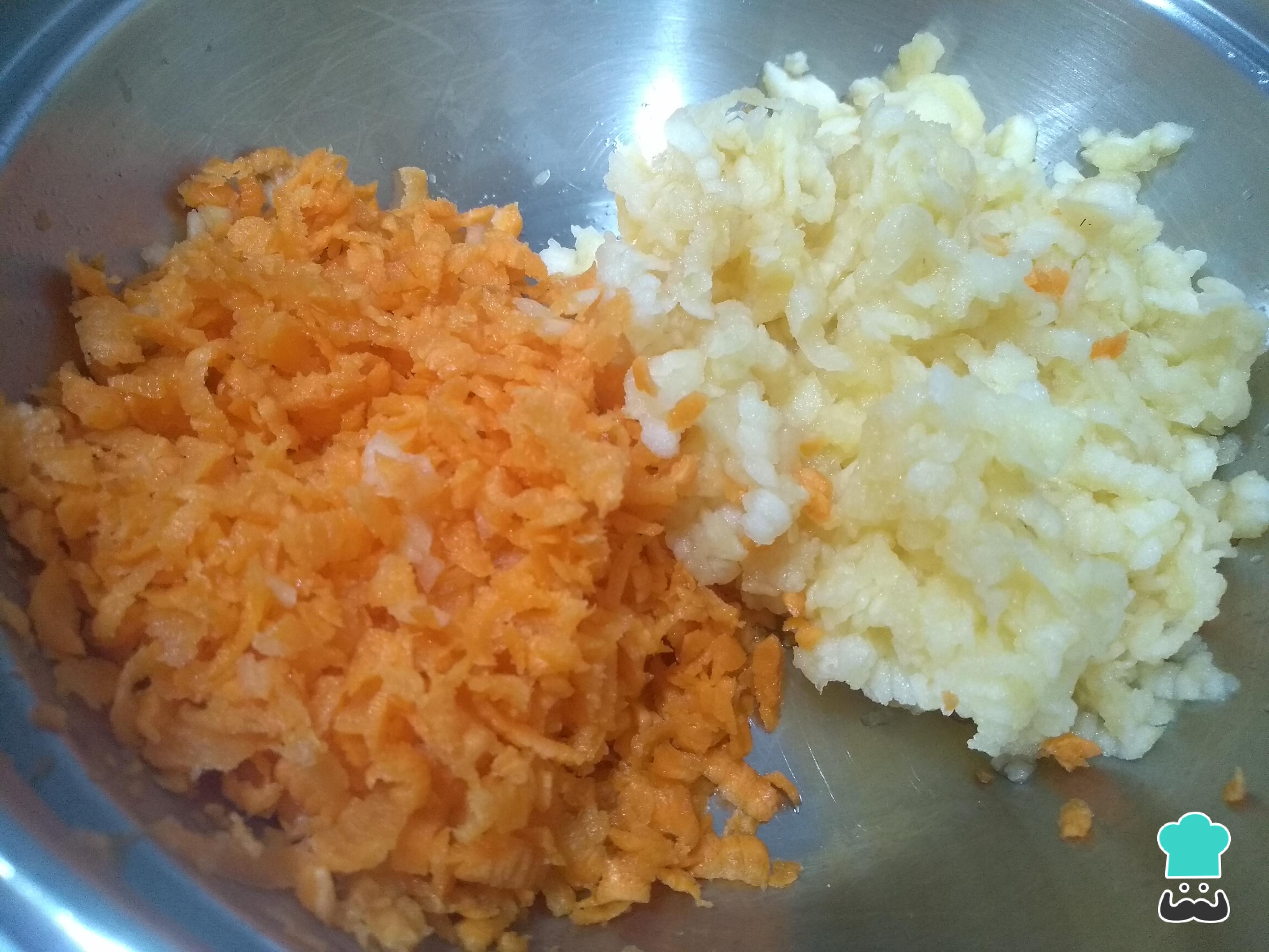 Pela las manzanas y las zanahorias, rállalas y resérvalas. Enciende el horno a 200 ºC con calor arriba y abajo.
