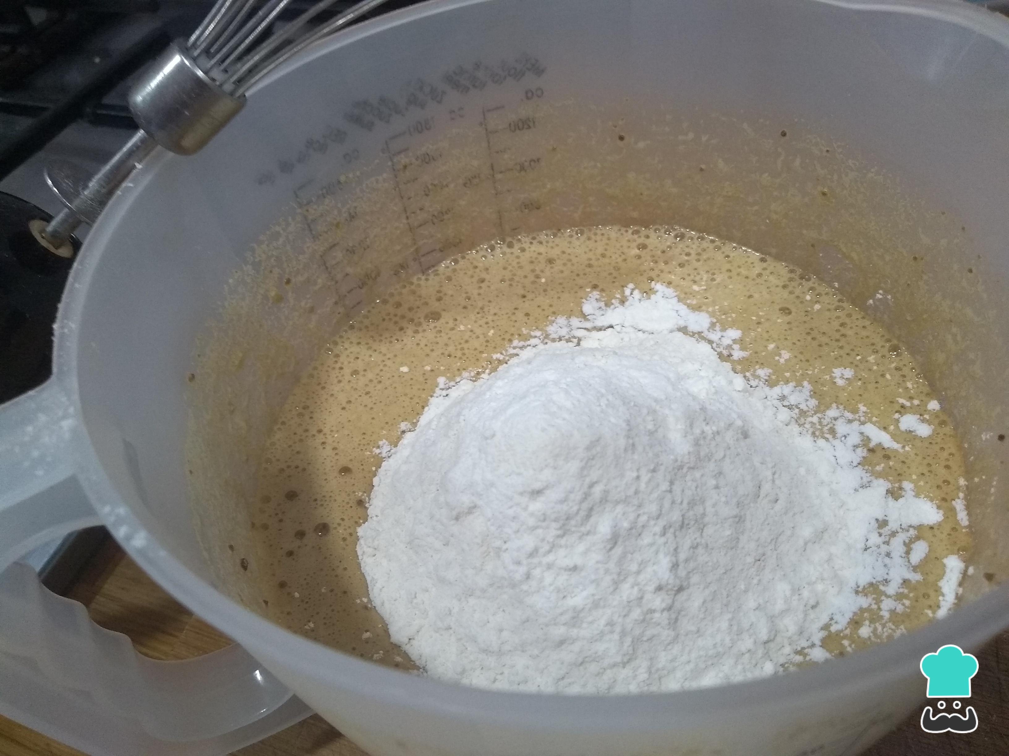 Agrega los dos tipos de aceite y sigue batiendo para integrarlos. A continuación, añade la harina de repostería y continúa batiendo hasta que se forme una masa más bien espesa. Si la harina no es de repostería (leudante), entonces añade un sobre de 16 gramos de levadura química (polvos de hornear). Puedes tamizar antes la harina para que la masa quede más fina y con más aire.